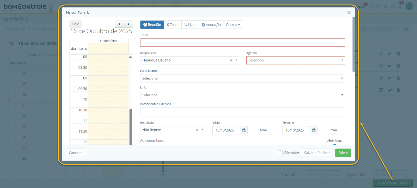 Agora que entendemos a tela de listagem e seus controles, vamos ao cadastro de uma nova tarefa, especificando os campos disponíveis, suas regras de preenchimento e como cada opção impacta o funcionamento da agenda e dos demais módulos do BomControle.