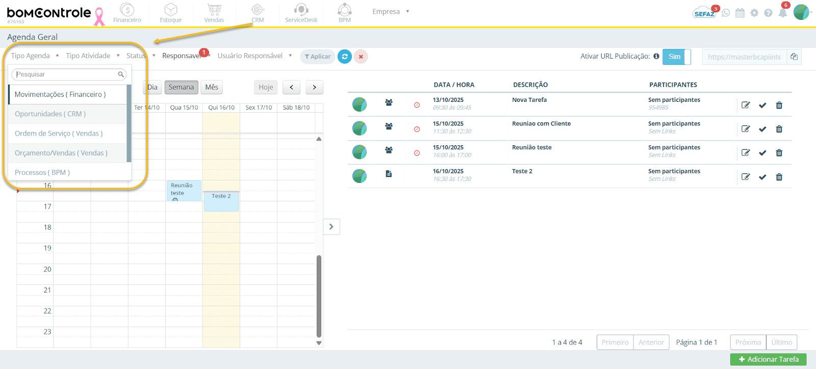 Impacto: O filtro de Tipo Agenda ajuda a focar nas tarefas de interesse por área. Na Agenda Geral, deixar vazio ou selecionar "todos" equivale a exibir tarefas de todos os módulos.