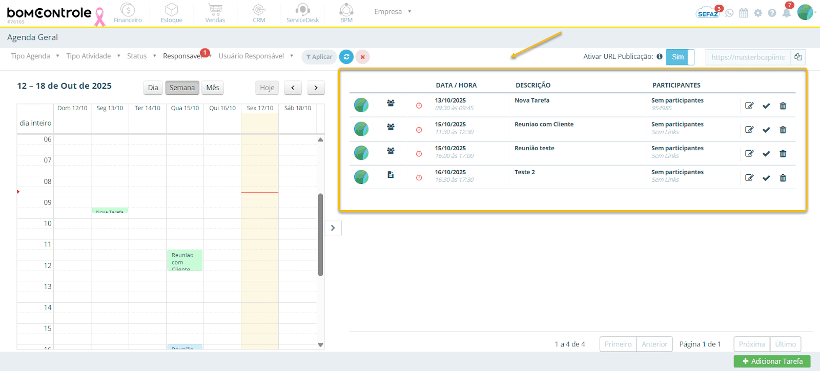 Lista de Tarefas (grid): Relação tabular das tarefas conforme os filtros aplicados. Exibe informações como data/hora, título/descrição, participantes e links relacionados, além de indicar tarefas atrasadas ou já realizadas.