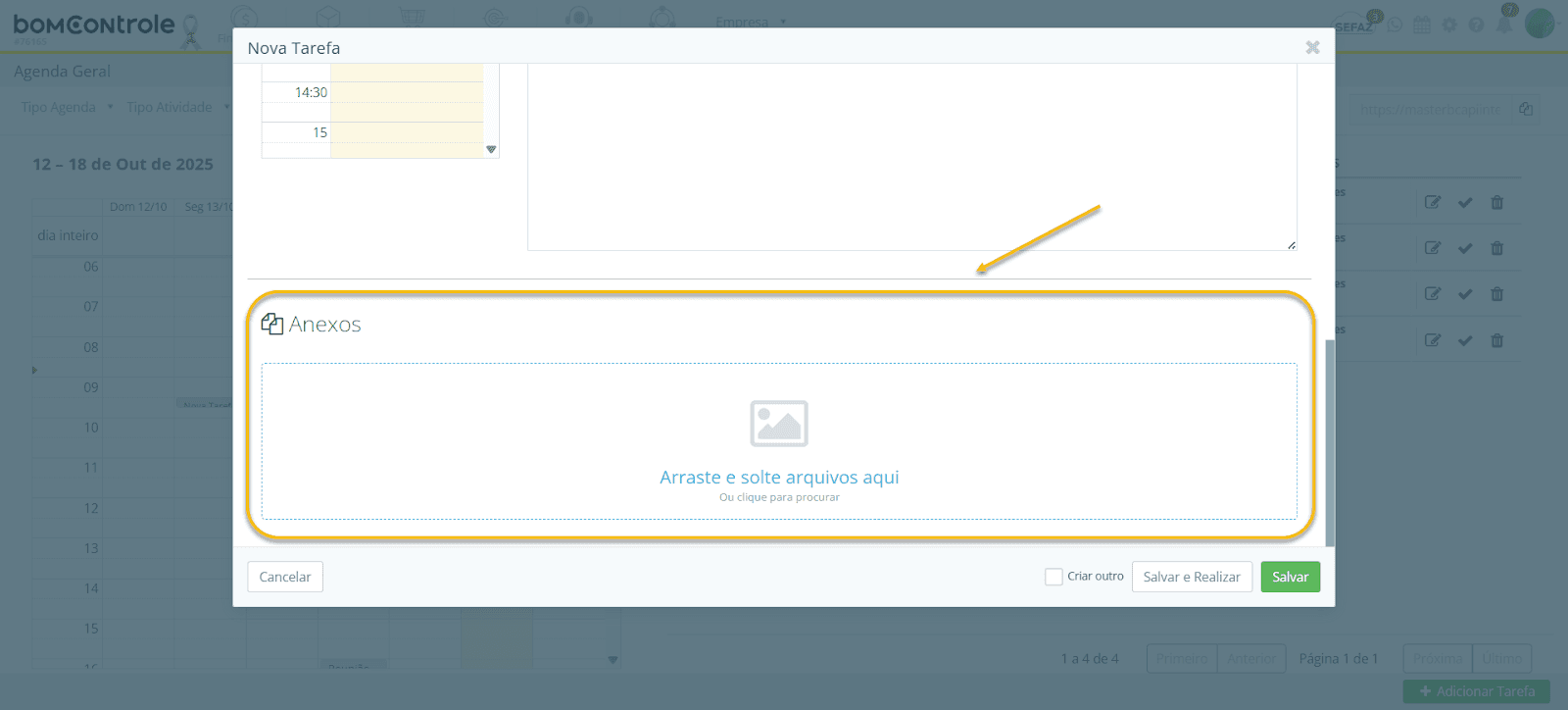 Impacto: Os arquivos anexados são enviados para o servidor do BomControle e ficam associados à tarefa: - Usuários internos podem baixar ou visualizar esses anexos ao abrir a tarefa (útil para compartilhar documentos entre os participantes de forma centralizada).