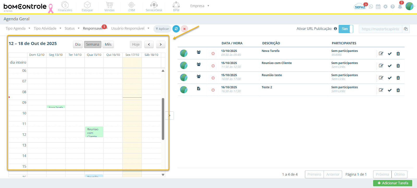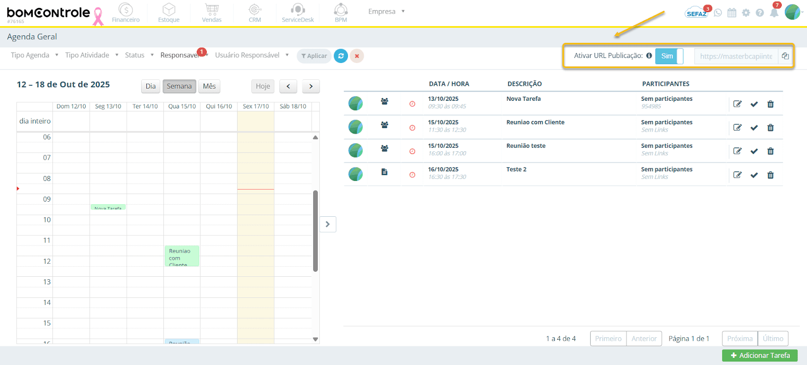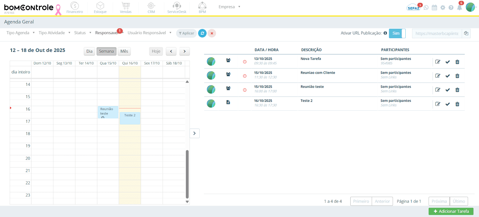 - Por fim, a funcionalidade de URL de Publicação da Agenda (calendário público) permite que um usuário integre sua Agenda BomControle a aplicativos externos. Por exemplo, um gerente pode visualizar todos seus compromissos do BomControle em seu celular via Google Agenda. Essa sincronização unidirecional (do BomControle para o externo) significa menos chance de esquecer algo porque está tudo em uma única agenda pessoal consolidada.