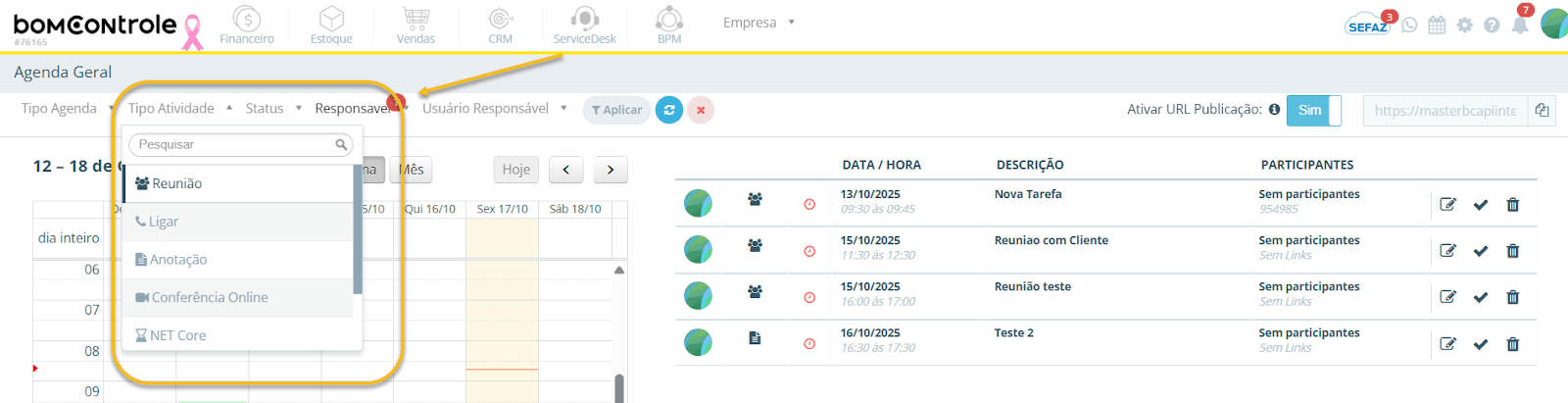 Tipo de Atividade: Filtro por categoria da atividade (ex.: reunião, ligação, tarefa técnica, etc.), permitindo refinar o tipo de compromisso exibido.