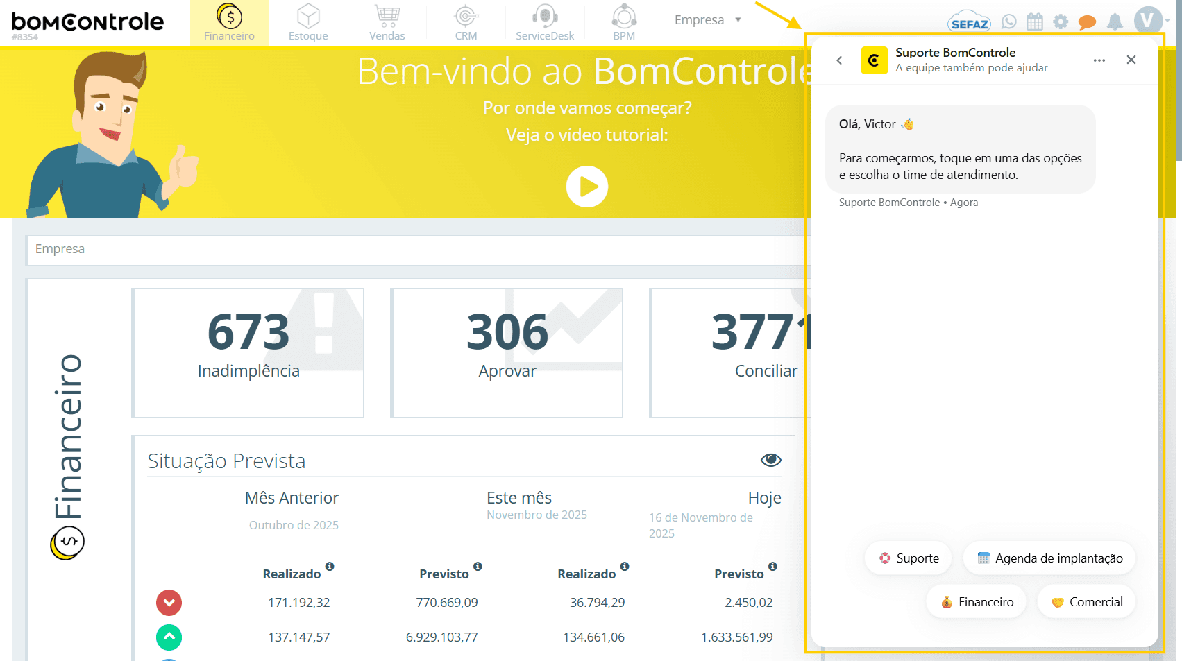 Suporte (Técnico): ✅ Opção disponível para todos os clientes. Selecionando Suporte, você iniciará um chat com a equipe de suporte técnico do BomControle.