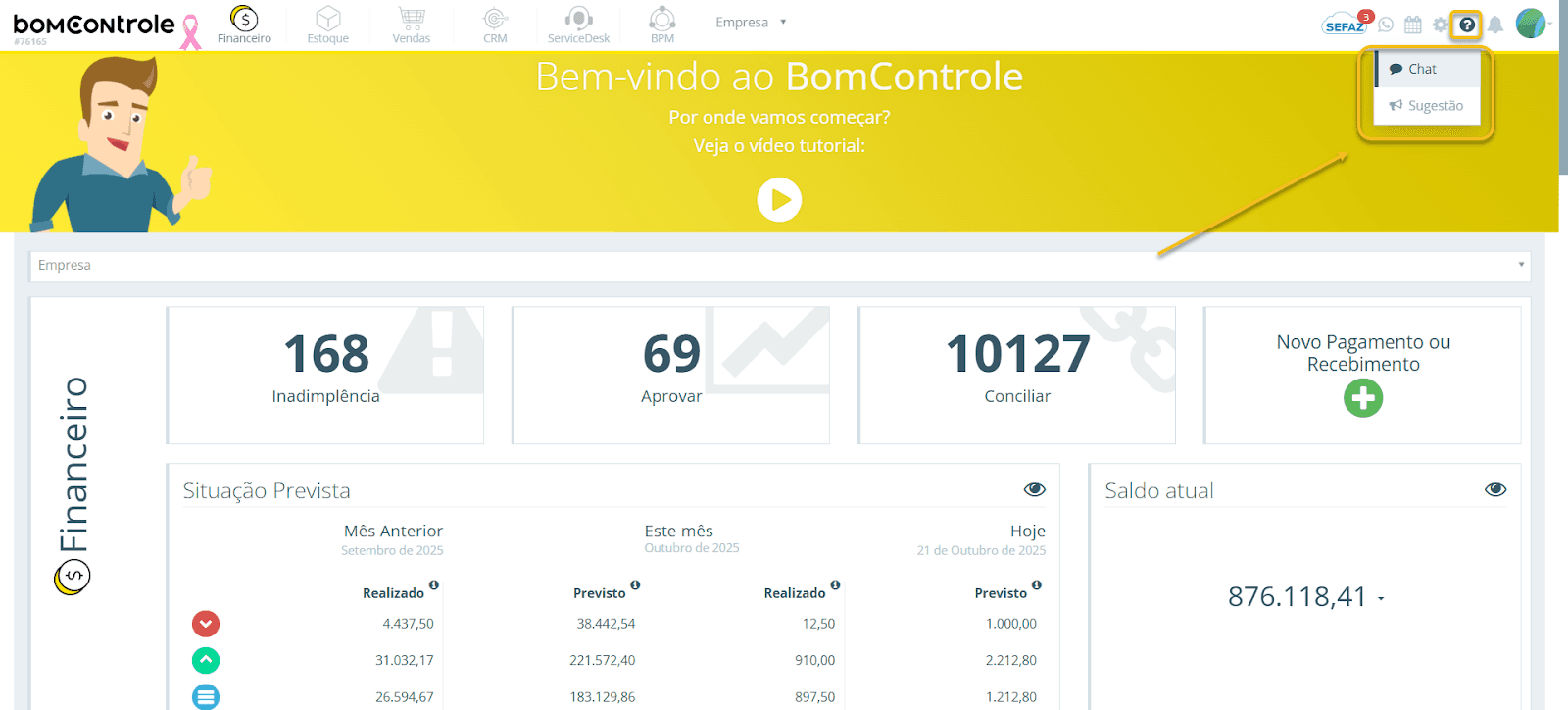 Uso típico: Utilize o chat de suporte para perguntar como realizar determinadas operações no sistema, reportar eventuais erros ou mensagens de erro que apareceram, solicitar orientações sobre configurações, ou qualquer outra questão técnica relacionada ao uso do BomControle. A equipe de suporte está treinada para ajudá-lo a usar melhor o ERP e geralmente responde em poucos instantes durante o horário de atendimento.