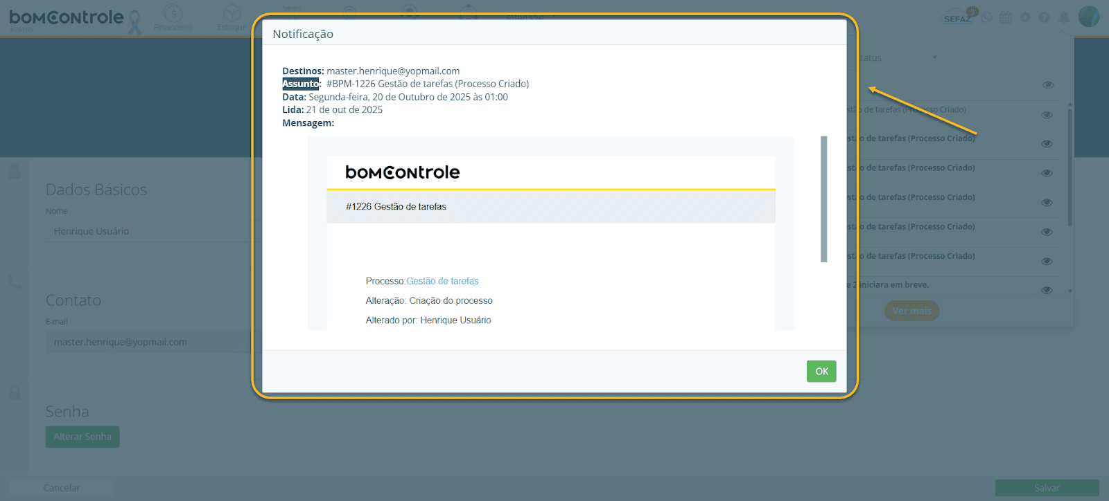 Impacto dessa ação: Assim que o popup é fechado, o sistema marca automaticamente aquela notificação como lida (caso ainda não estivesse). Você notará, ao retornar à lista (se ela ainda estiver aberta), que o item em questão não estará mais em negrito e o contador de novas notificações terá sido atualizado. Isso acontece mesmo que você não clique especificamente no olho para marcar como lido – a visualização já conta como leitura.
