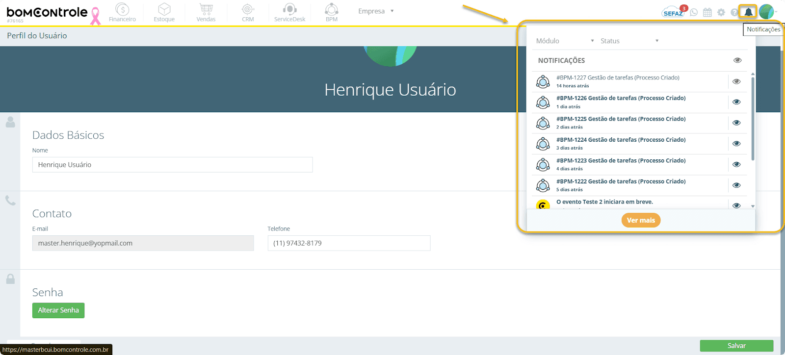 Este manual orienta o usuário final sobre como utilizar a funcionalidade de Notificações no BomControle. O sistema de notificações informa o usuário sobre eventos, alertas e atualizações importantes nos diversos módulos (Financeiro, Vendas, CRM, etc.), garantindo que nenhuma informação relevante passe despercebida.