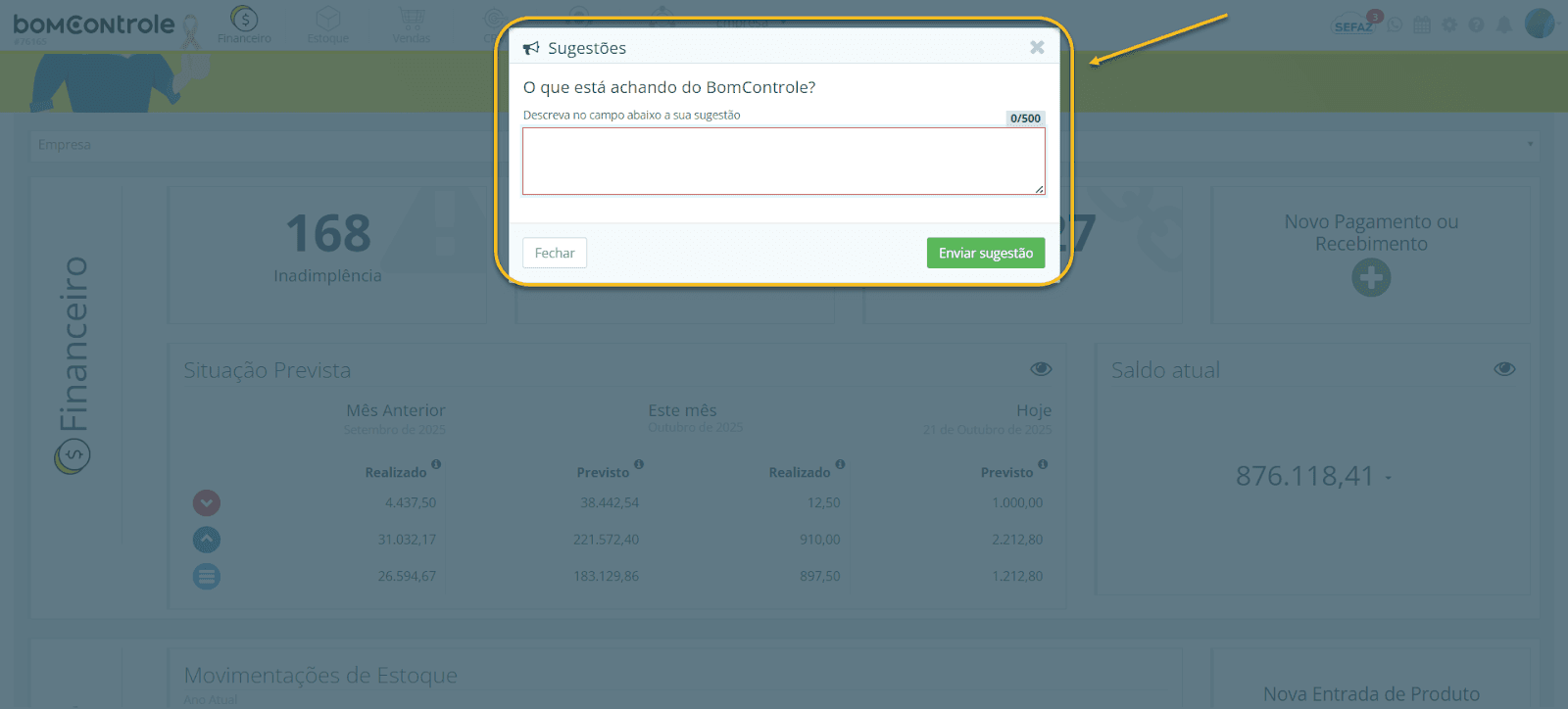 A figura abaixo destaca a janela de sugestão do BomControle, onde o usuário pode escrever sua ideia ou comentário e submetê-lo para avaliação.