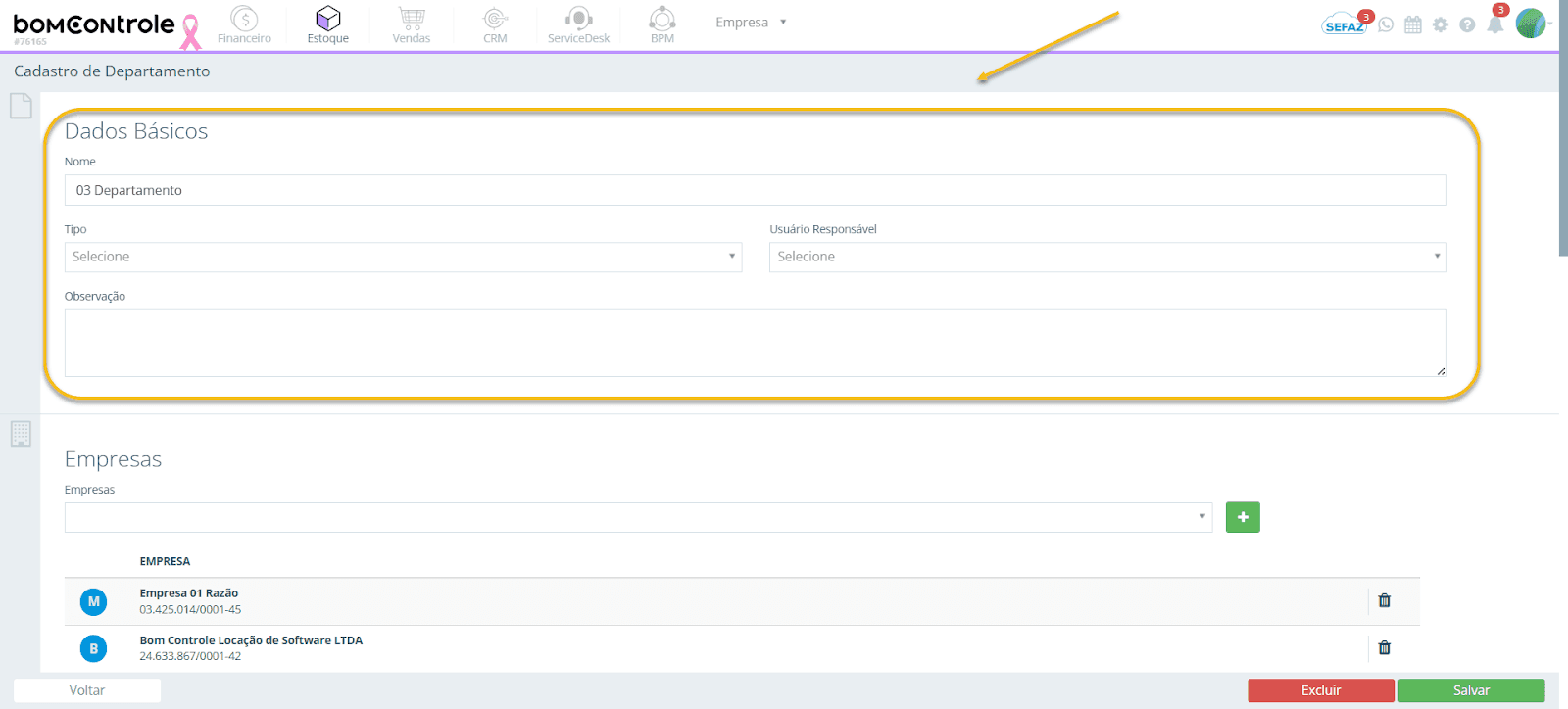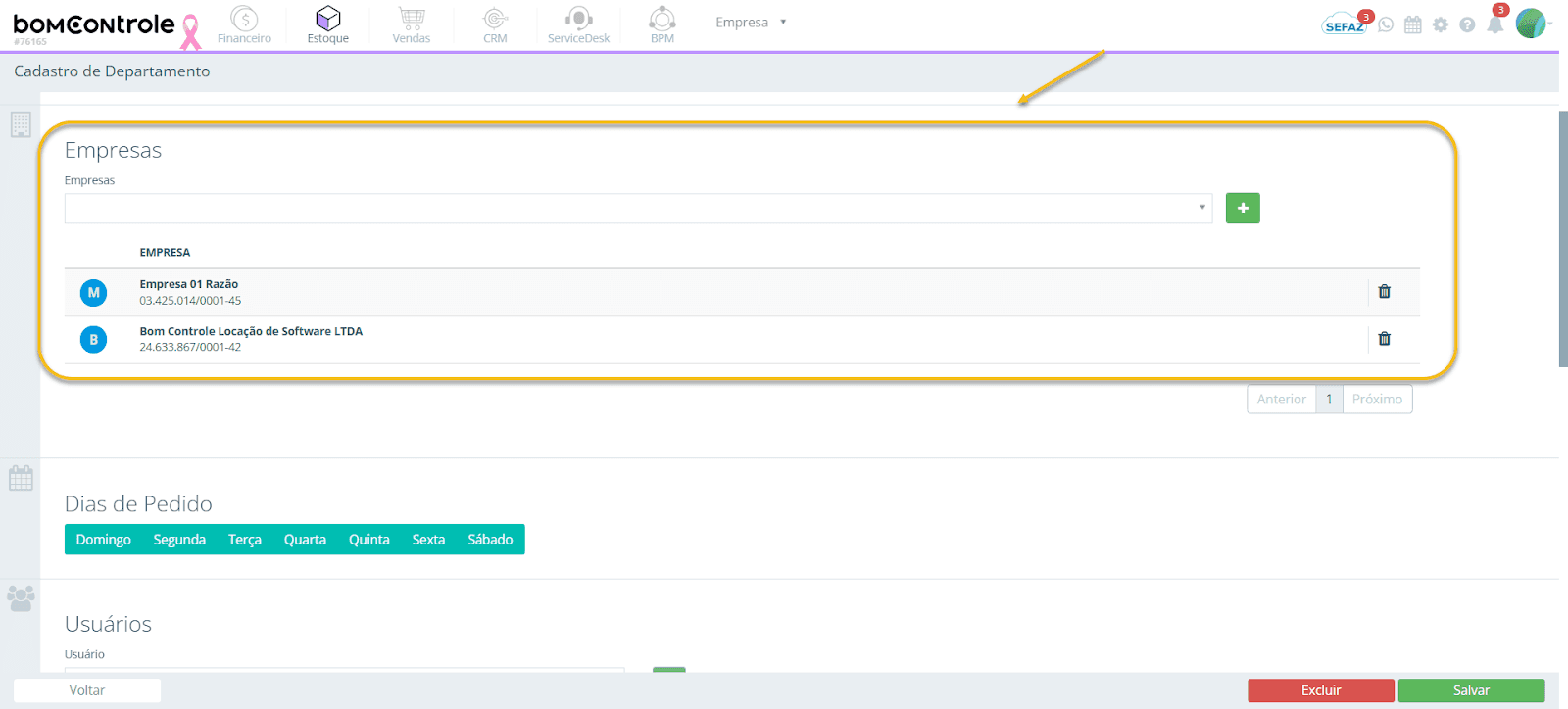 Figura 3 – Empresas vinculadas no cadastro de Departamento