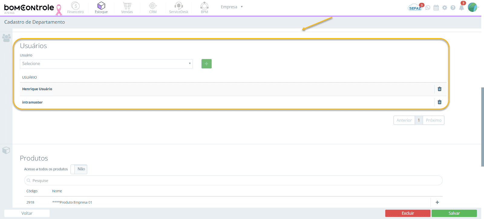 Os produtos já associados ao departamento aparecerão em uma tabela abaixo, com opção de removê-los (ícone de lixeira). Somente produtos das empresas vinculadas ao departamento serão listados para seleção – ou seja, primeiro vincule as empresas na seção anterior, depois escolha produtos pertencentes a essas empresas. Não há limite de produtos que podem ser vinculados.