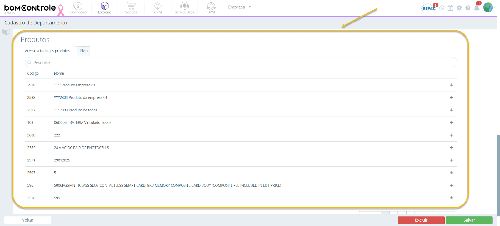 Figura 6 – Produtos no cadastro de Departamento