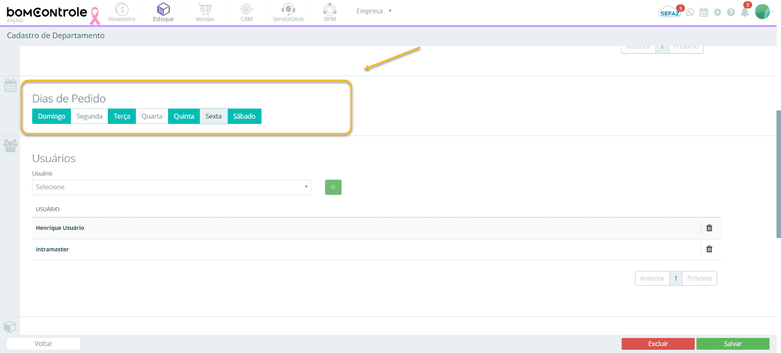 Integração com o Módulo de Estoque: Caso sua empresa utilize o módulo de Estoque do BomControle, o cadastro de Departamento apresentará as duas configurações extras descritas (Dias de Pedido e Produtos). Configure essas opções conforme sua necessidade operacional no estoque, garantindo que cada departamento acesse somente os itens e realize pedidos nos dias pertinentes. Se o módulo de Estoque não for utilizado, essas seções não aparecerão e não precisam de nenhuma ação.
