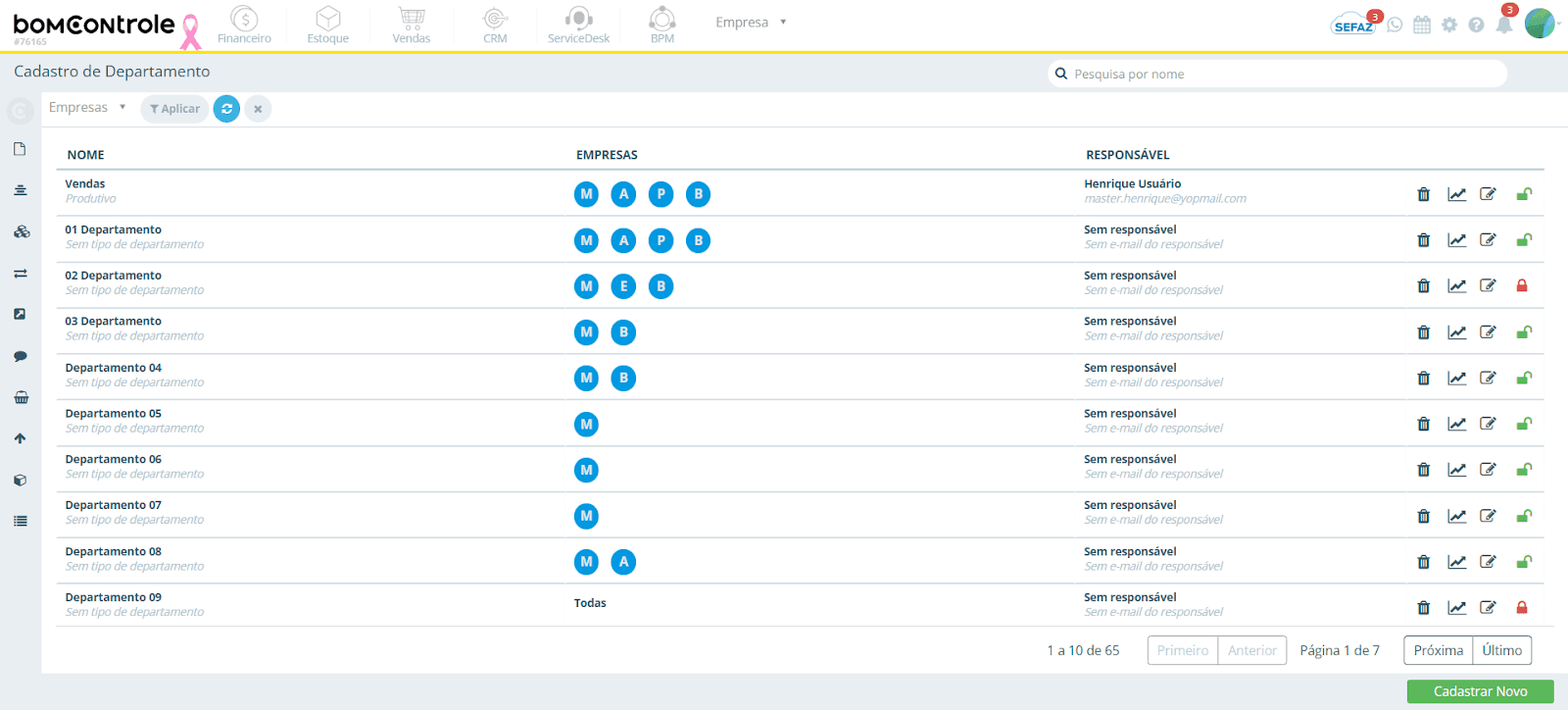 A tela de listagem de departamentos será exibida, mostrando os departamentos já cadastrados. Use o botão Cadastrar novo para incluir um novo registro ou o ícone de lápis (editar) para modificar um item existente.