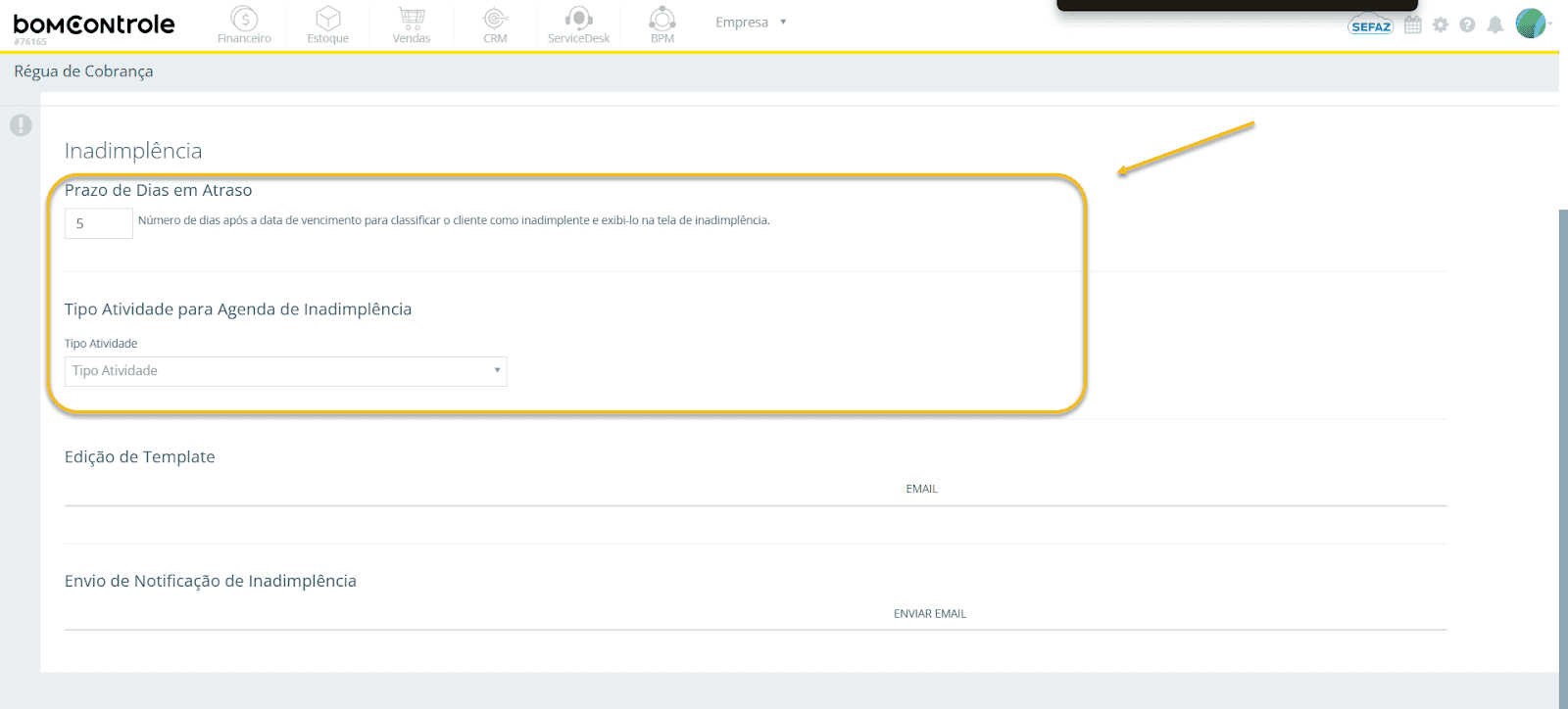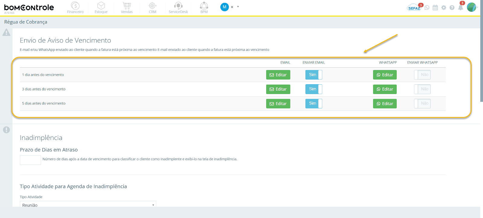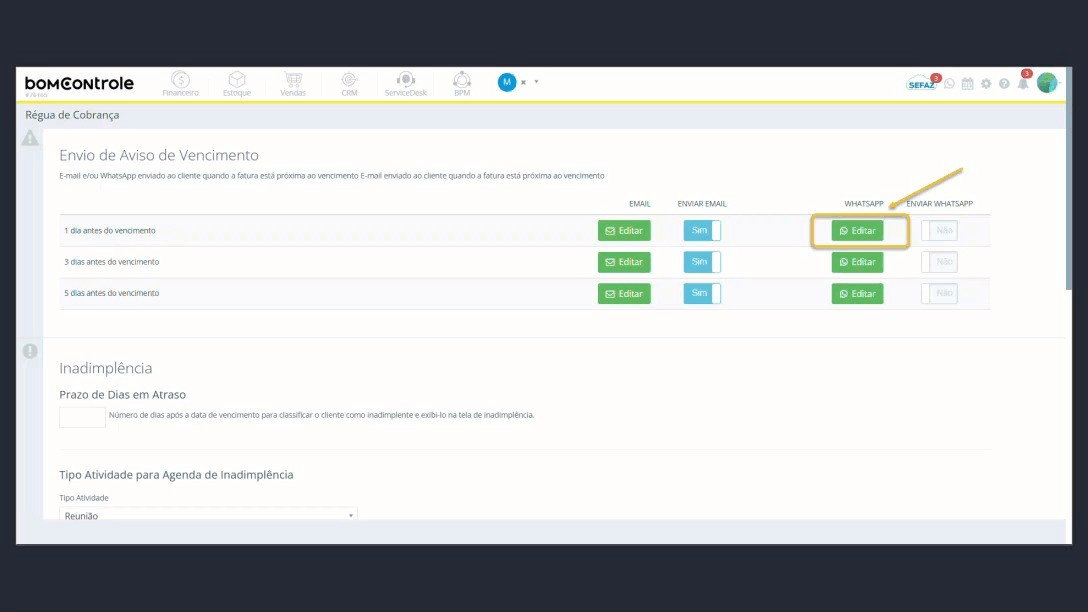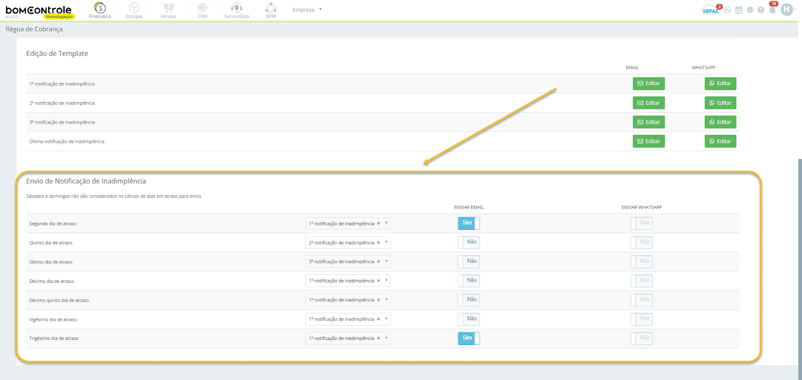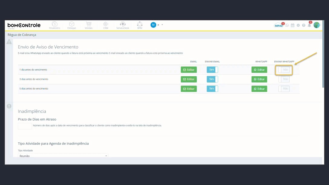 ⚠️ Envio de Notificação de Inadimplência (configuração por dias de atraso):