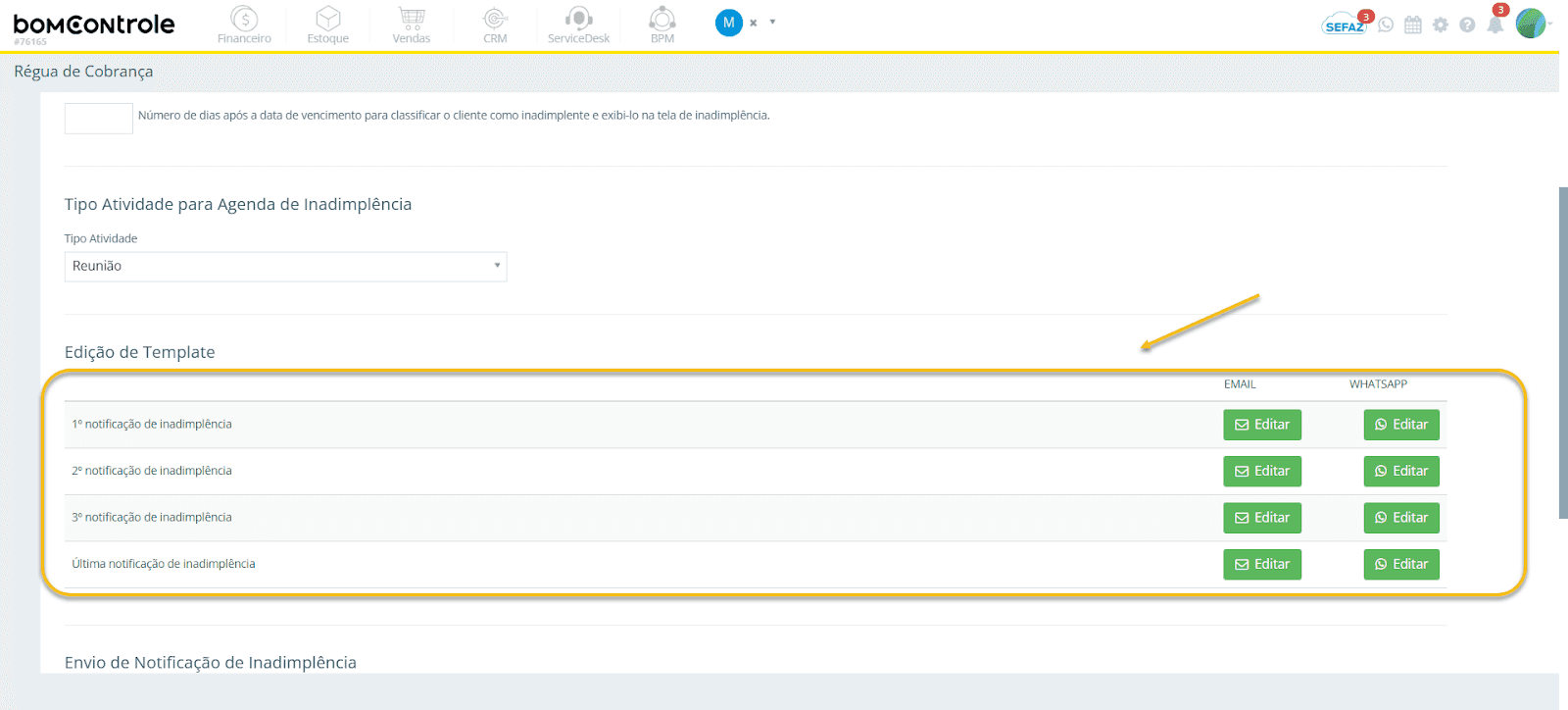 - Regras de preenchimento: Campo opcional. Nesta subseção “Edição de Template”, o BomControle lista até quatro modelos de notificações de cobrança que podem ser editados: normalmente correspondem ao 1º Aviso, 2º Aviso, 3º Aviso e Último Aviso de cobrança para clientes inadimplentes.