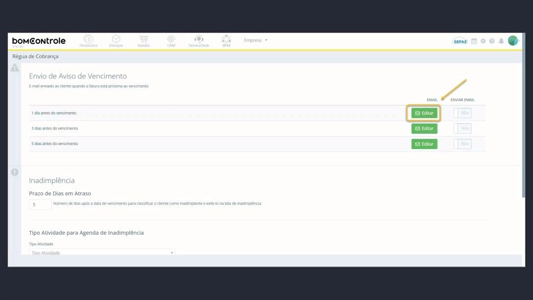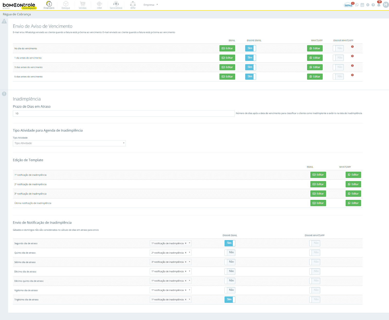 Observação Importante: Para fins de envio das notificações automáticas de inadimplência, o BomControle considera apenas dias úteis na contagem do atraso. Sábados e domingos não são considerados no cálculo de dias em atraso para envio.