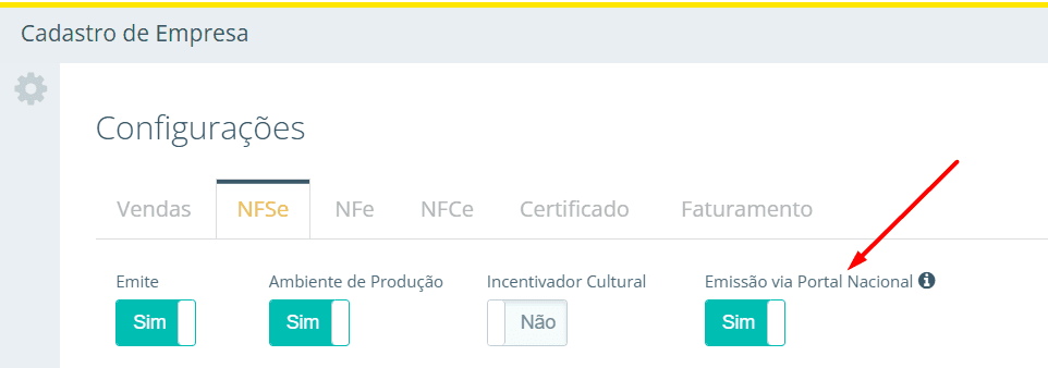 Ainda no cadastro da sua empresa, desça até o final da tela, e clique na aba “NFSe”. Nela, você irá clicar para habilitar a opção “Emissão via Portal Nacional”: