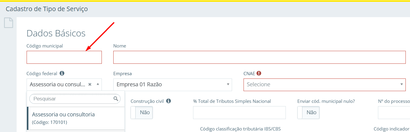 3. Nos campos “Código Municipal” e “Código Federal”, substitua os valores