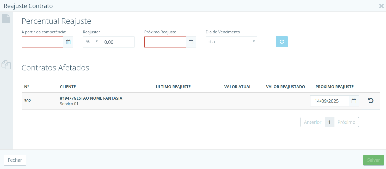 Abre-se então a janela de Reajuste de Contratos, onde você informará o percentual ou novo valor conforme o índice aplicado e a partir de qual competência o reajuste valerá.