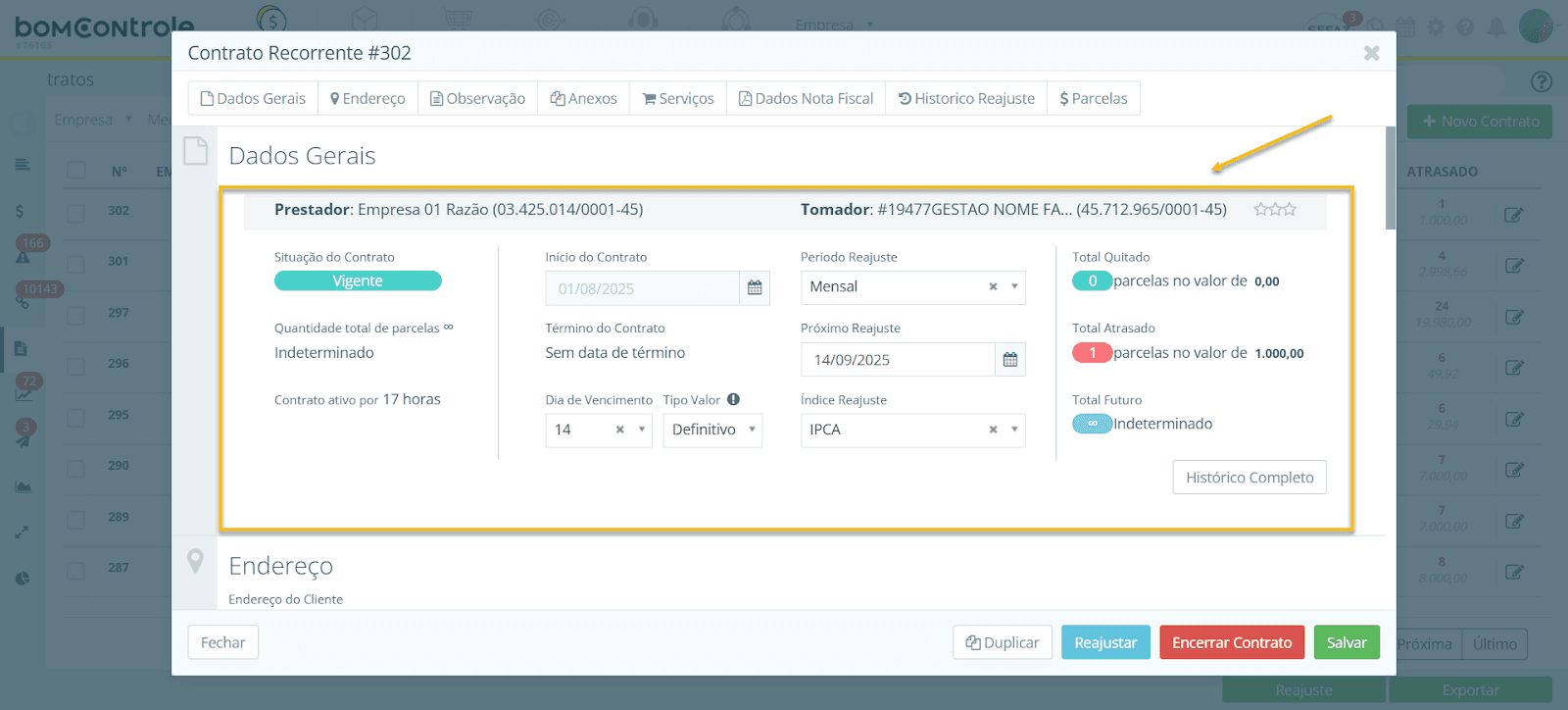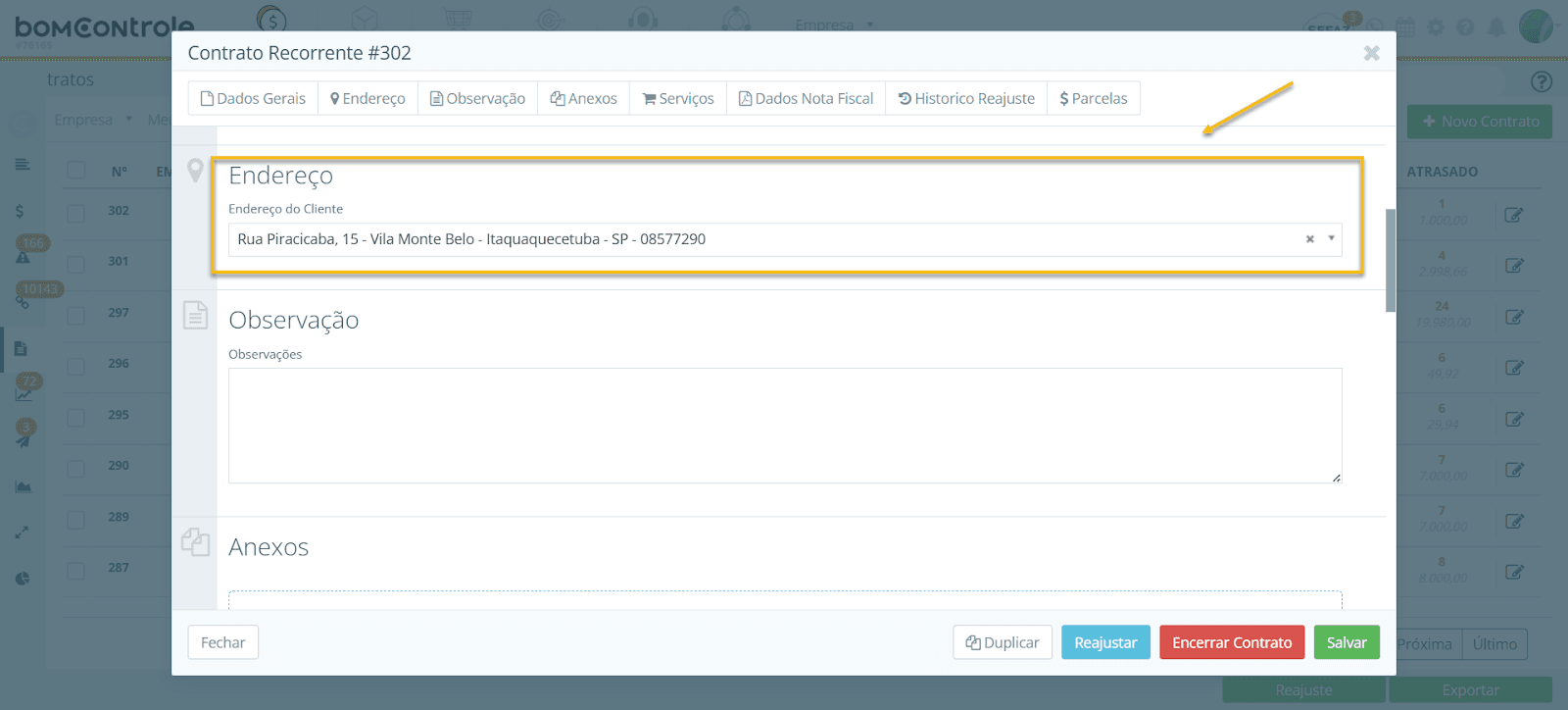 Qualquer modificação nos campos de vigência, endereço, nota fiscal, etc., passa a valer e pode refletir imediatamente nas parcelas futuras.