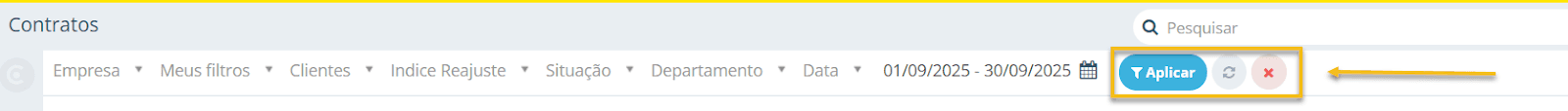 Recarregar: Recarrega a lista usando os filtros já aplicados mais recentemente. Útil para atualizar a tela e obter novos contratos ou mudanças sem alterar os filtros. Este botão fica habilitado apenas quando não há alterações não aplicadas nos filtros atuais. Se você modificar algum filtro, primeiro o botão Aplicar ficará disponível (e o Recarregar é desativado até aplicar ou limpar as mudanças).