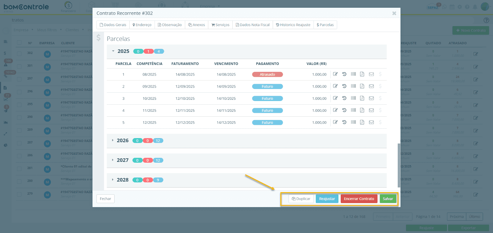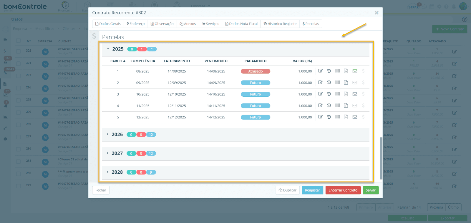 A seção Parcelas é crucial, pois detalha todas as cobranças geradas pelo contrato ao longo de sua vigência. Aqui você visualiza o cronograma de faturamento e pagamento, podendo acompanhar e até ajustar parcelas específicas.