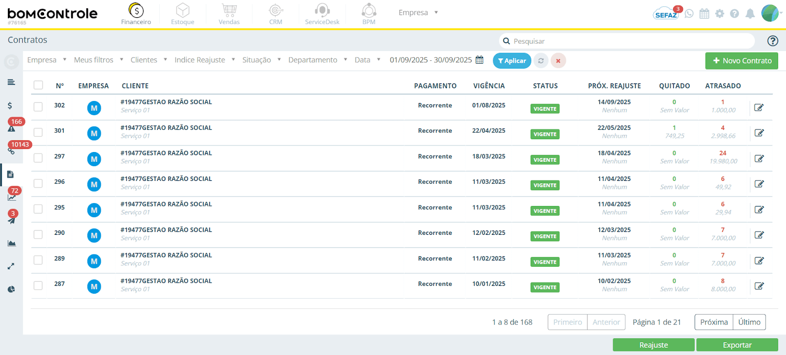 Reajuste: Permite reajustar o valor de um ou mais contratos de uma só vez. Para usar, marque os contratos desejados na coluna de seleção (☑) e clique em Reajuste.