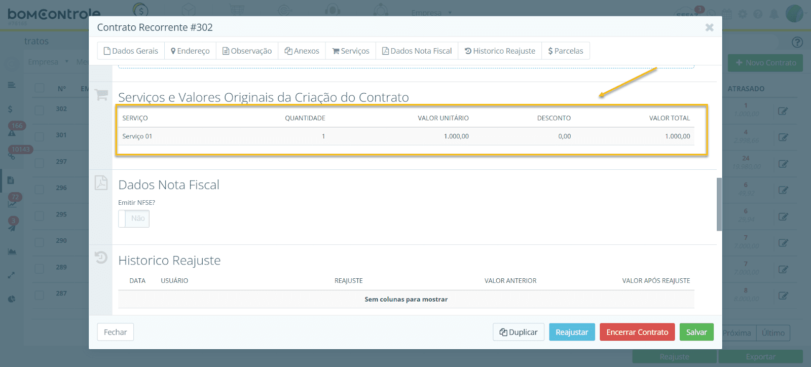 Lista de serviços vinculados naquele contrato (campo Serviços consolidado).