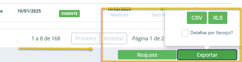 Exportar Detalhado por Serviço: Gera um Excel onde cada linha representa um serviço de um contrato (contratos com múltiplos serviços aparecem divididos em várias linhas), incluindo colunas de serviço, quantidade, valores unitários etc.