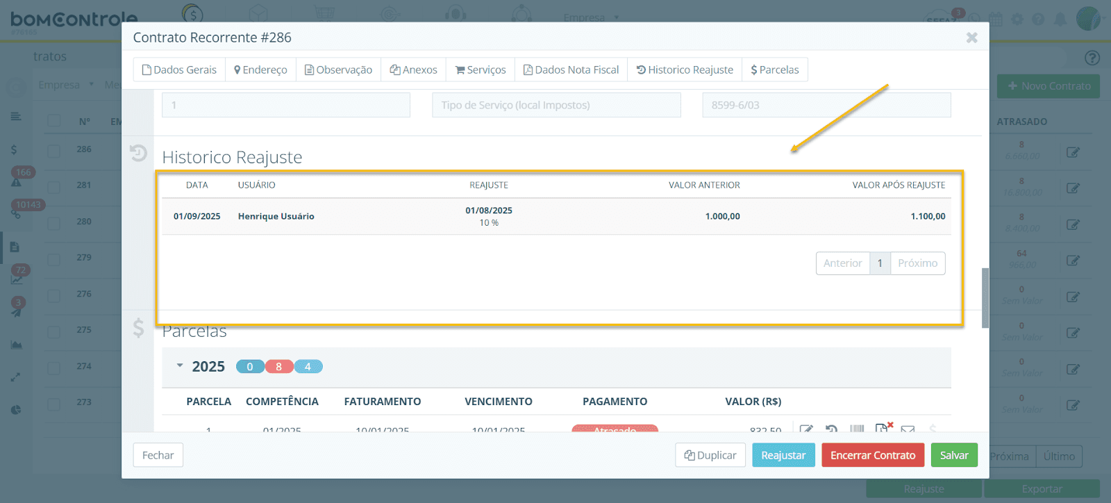 Esta seção apresenta um histórico específico dos reajustes realizados no contrato. Toda vez que for feito um reajuste nos valores (através da funcionalidade de reajuste de contrato), uma entrada será registrada aqui.