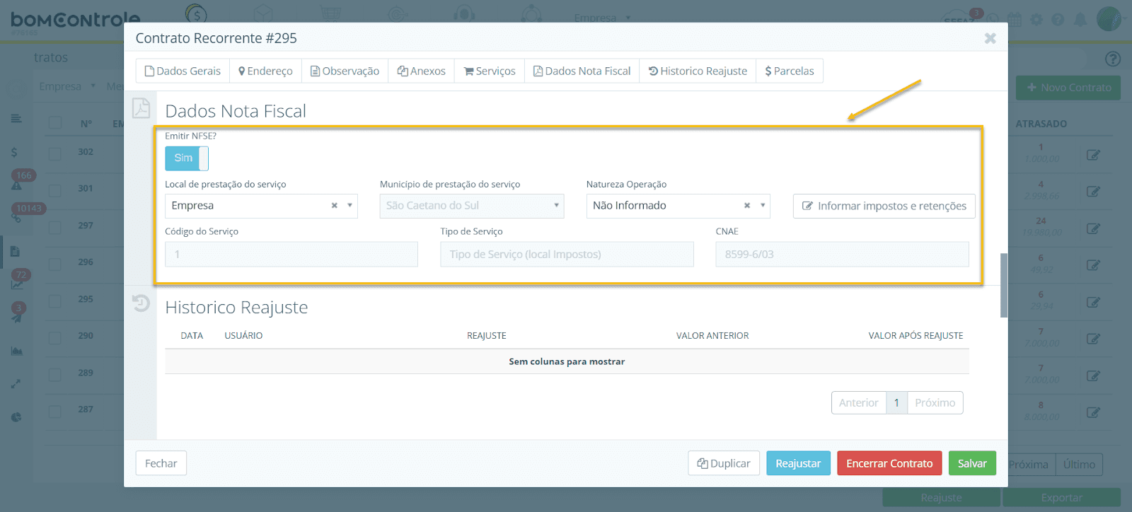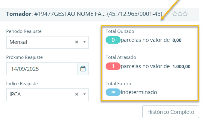 Próx. Reajuste: Exibe informações sobre reajuste de valor do contrato: