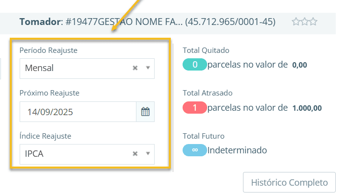 Na segunda linha (menor), o índice de reajuste adotado (por exemplo, “IPCA”, “IGP-M” etc.), se houver.