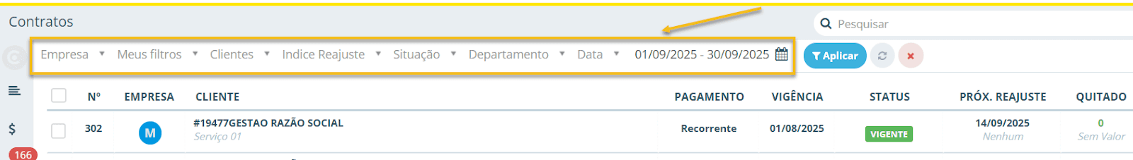 Meus Filtros: Salva e aplica conjuntos de filtros pré-definidos. Você pode criar filtros personalizados (como “Contratos de longo prazo”, “Contratos com reajuste”) e selecioná-los rapidamente aqui. Caso nenhum filtro salvo seja selecionado, os filtros manuais (empresa, cliente, etc.) serão considerados normalmente.