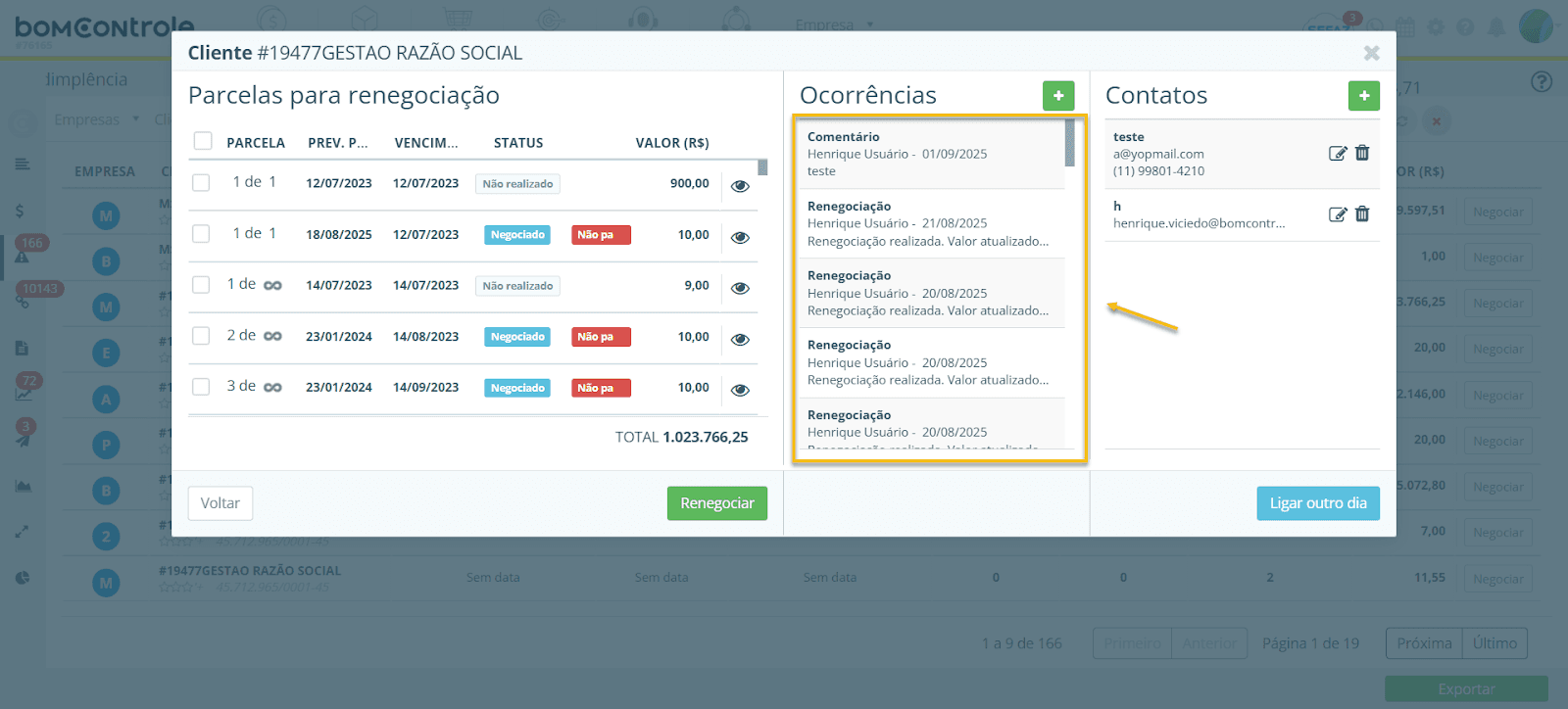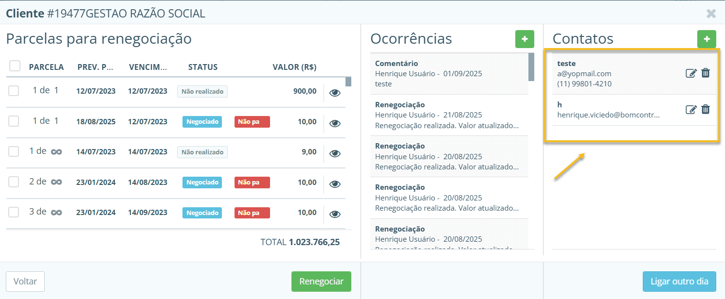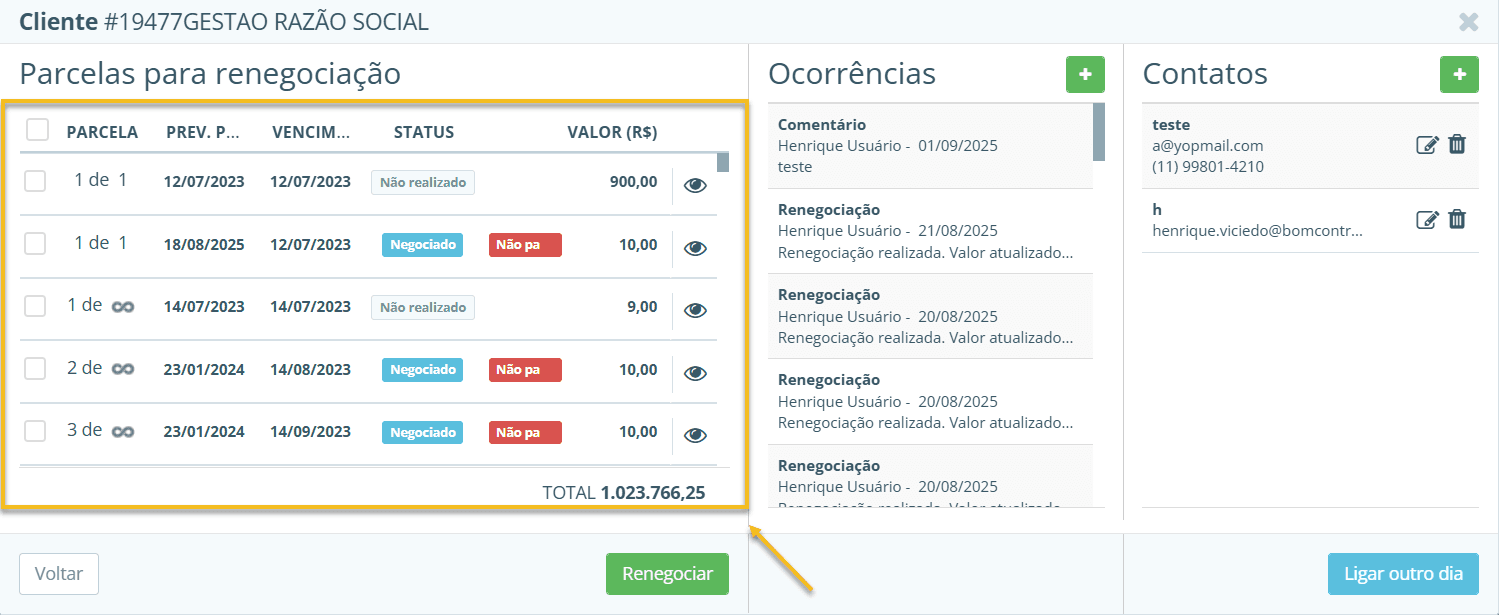 Na tela de negociação, além das parcelas, há uma seção dedicada a contatos e ocorrências relacionados à cobrança do cliente: