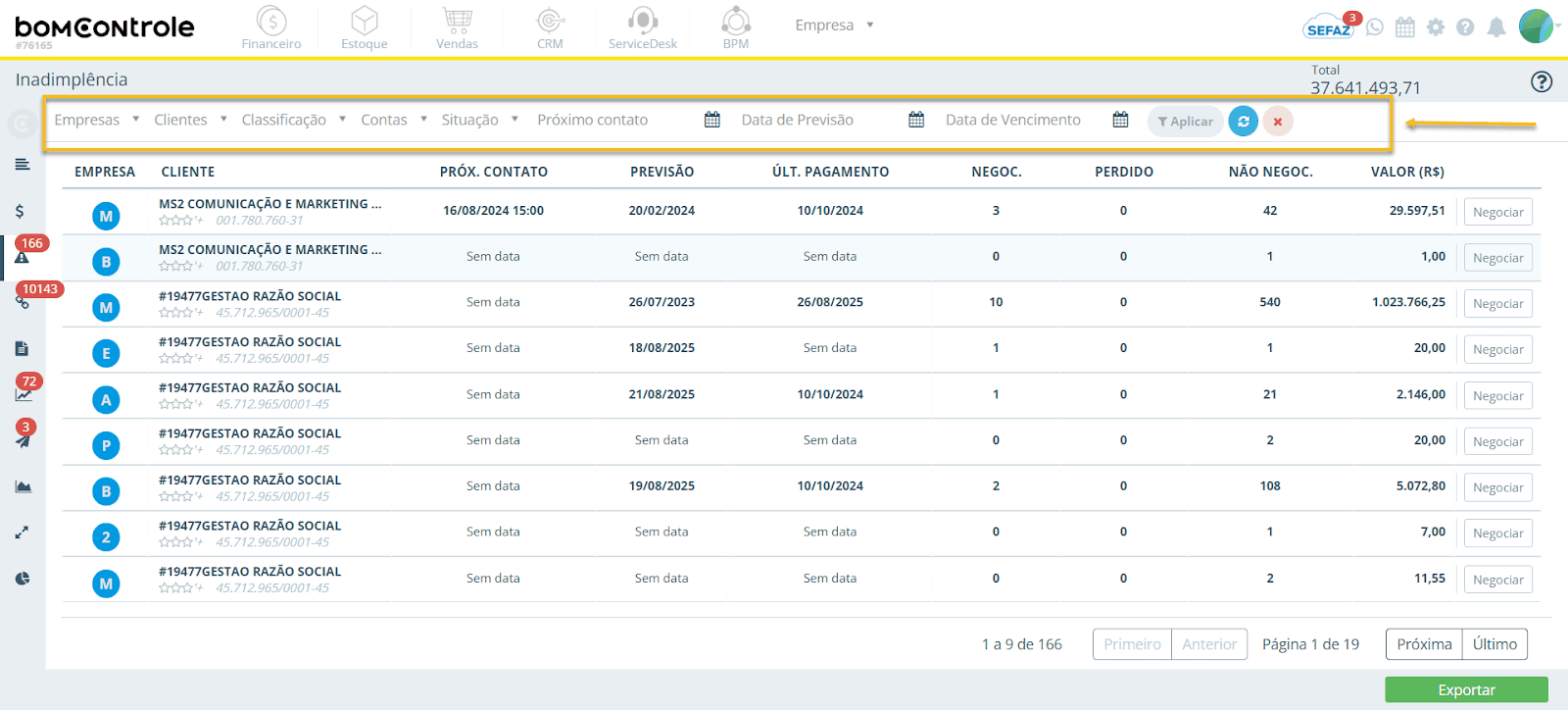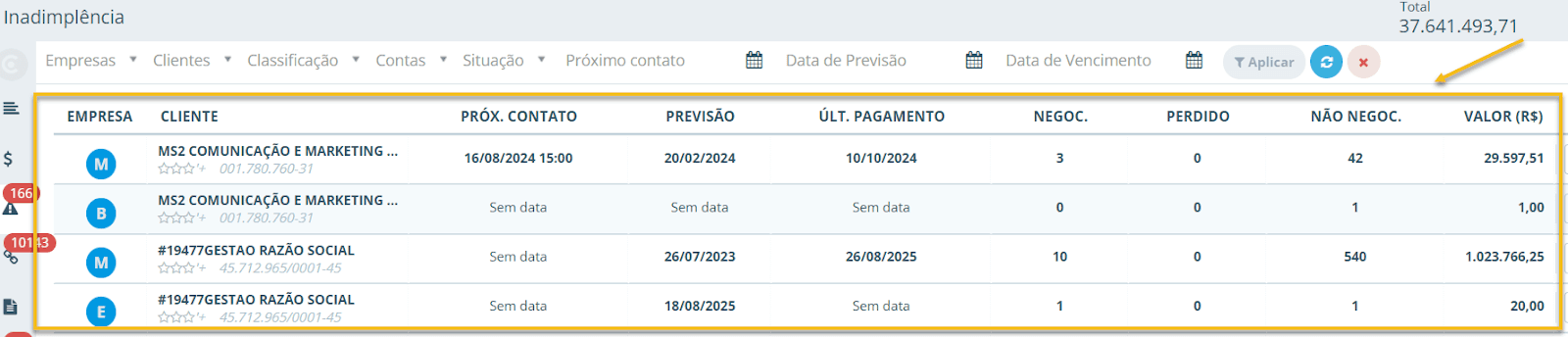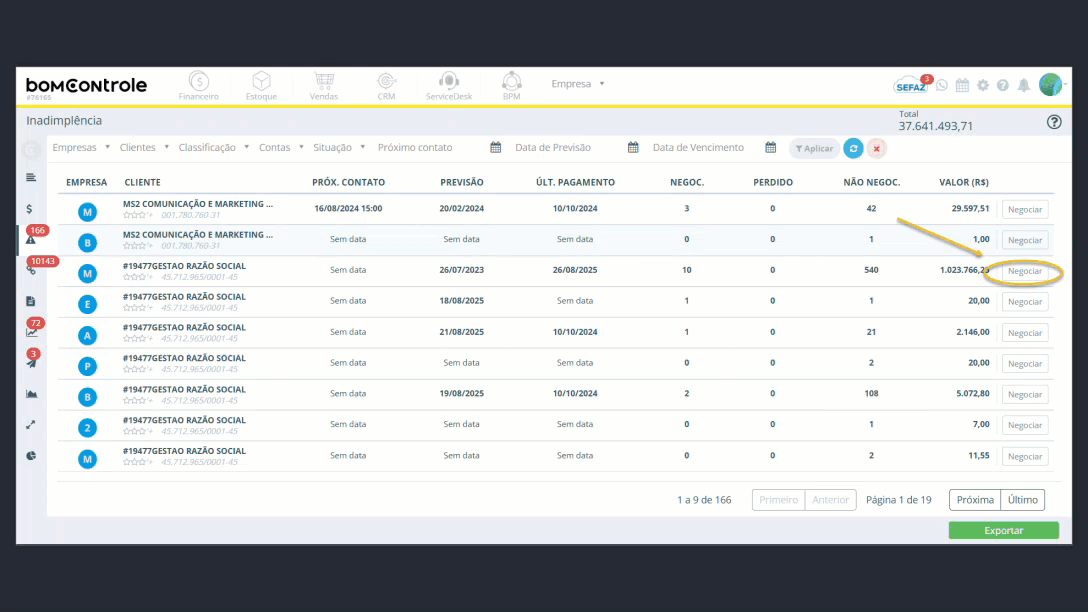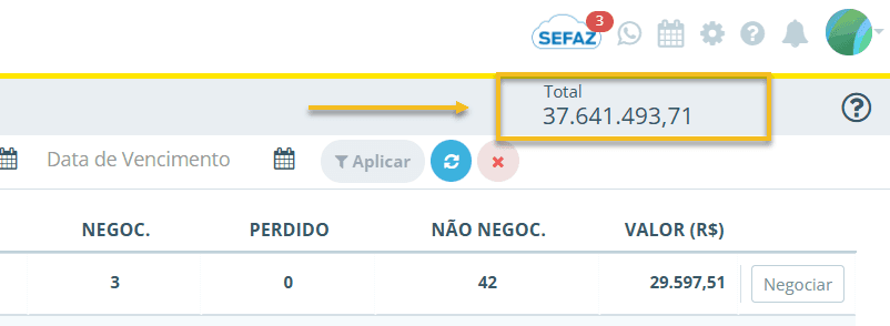 Exemplo: Se a coluna Negoc. mostra 2 para um cliente, quer dizer que ele tem duas parcelas em atraso nas quais já foi combinado algum pagamento (elas possuem data de previsão e estão aguardando cumprimento). Essa métrica dá ideia do progresso das negociações com o cliente.
