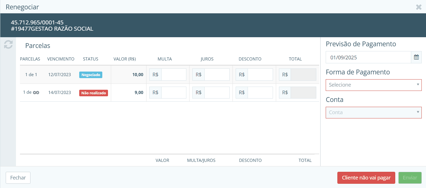 Lembre-se que negociação não garante pagamento: sempre monitore as previsões e, se possível, use a função de envio de confirmação (boletos, e-mails) pelo sistema para formalizar o acordo com o cliente, aumentando as chances de ele cumprir.
