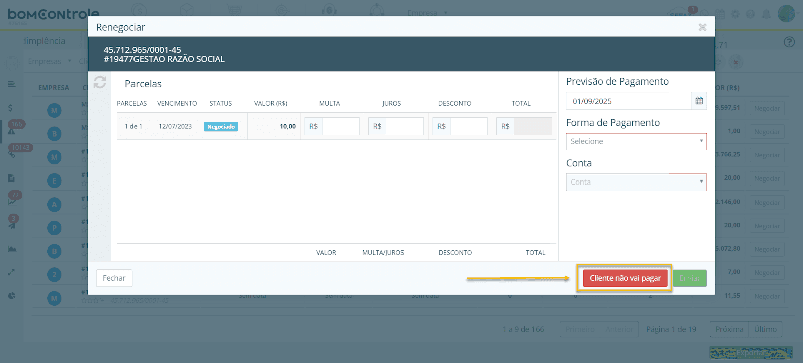 Cliente não vai Pagar: mostra os clientes que foram marcados explicitamente como “não vão pagar”. Nesses casos, geralmente após tentativas de cobrança, concluiu-se que o cliente não quitará a dívida. As parcelas desses clientes são consideradas perdidas (calotes).