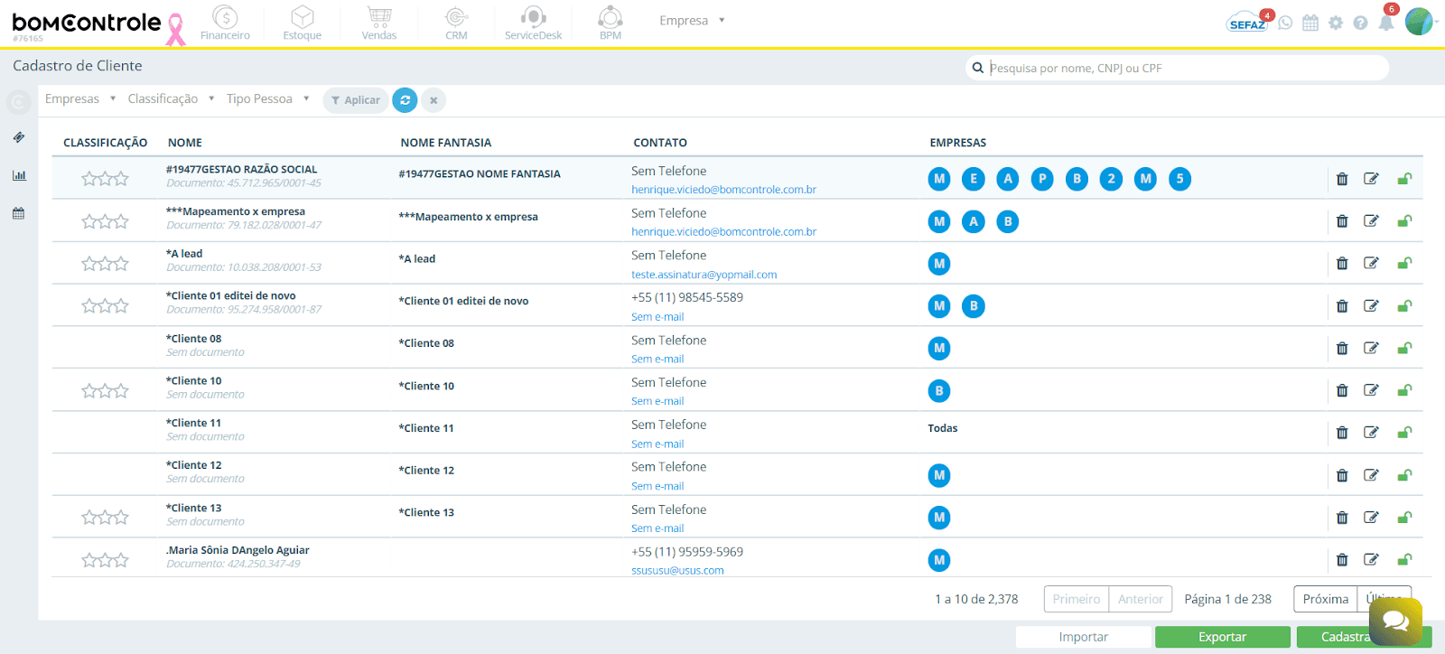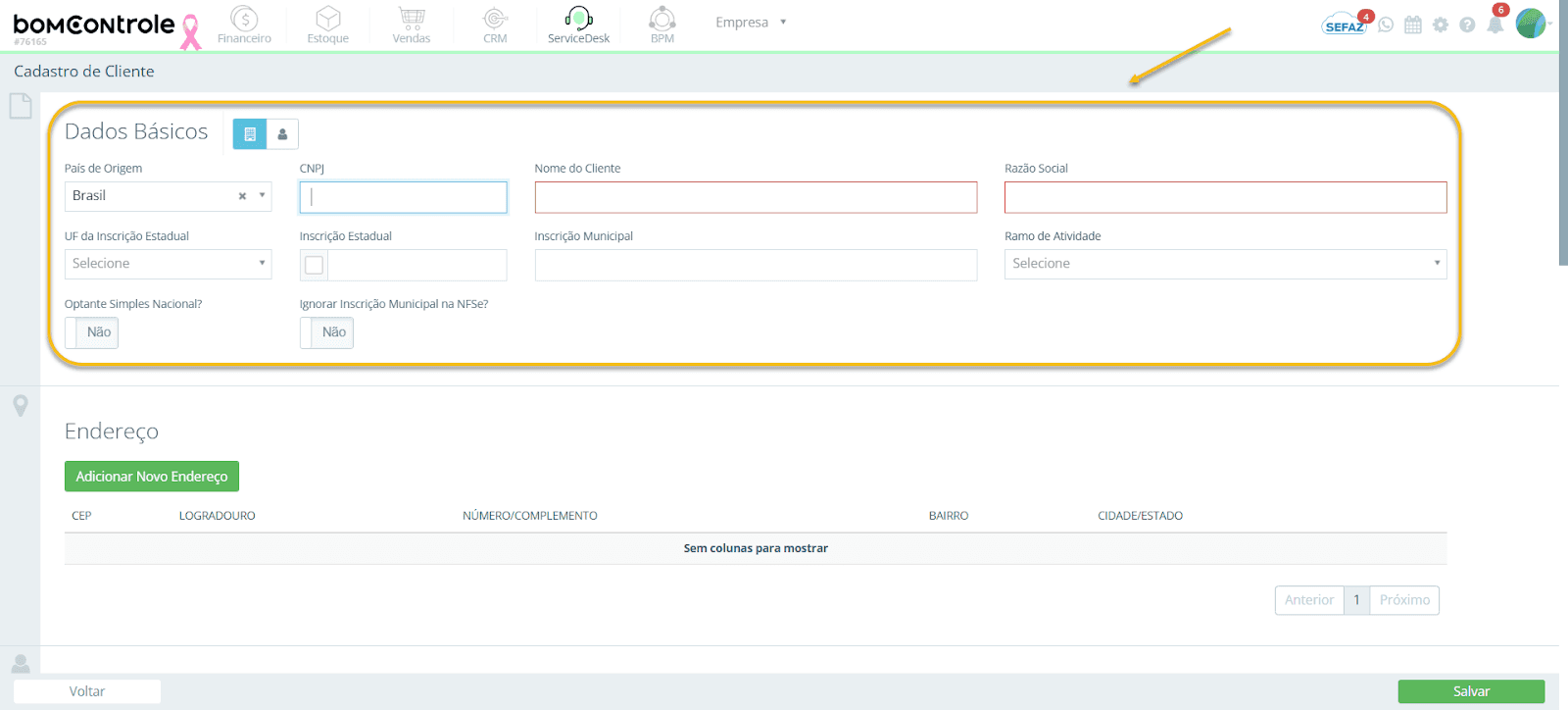 Integração entre módulos: O cadastro de cliente é único no sistema. Isso significa que se você cadastrar aqui pelo ServiceDesk, o mesmo cliente aparece no módulo Vendas e Financeiro automaticamente (respeitando as empresas vinculadas). Não é preciso duplicar cadastros. Portanto, capriche nas informações preenchidas — elas serão compartilhadas em todo o BomControle para facilitar seu trabalho.