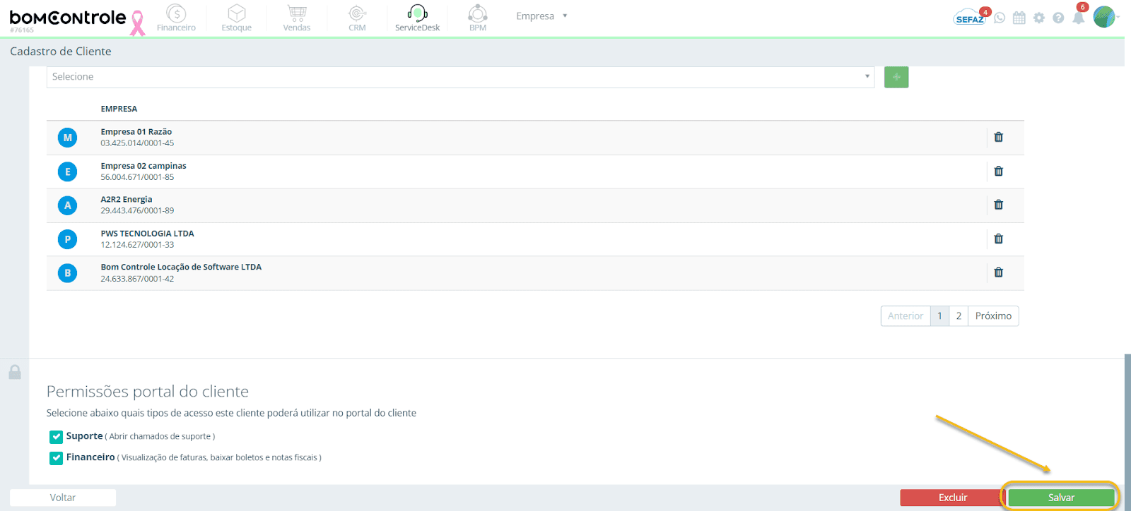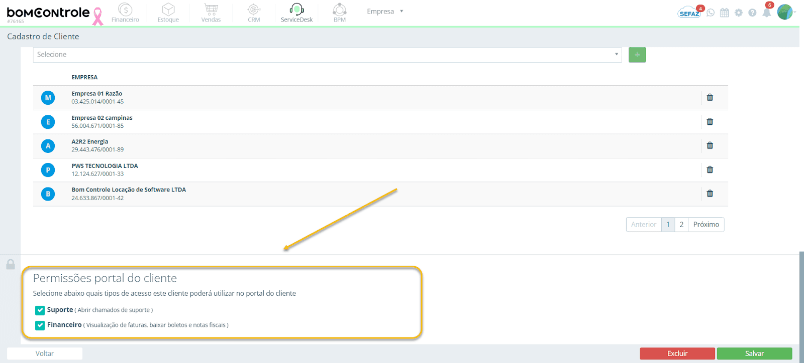 Nessa última seção, configuram-se as permissões de acesso do cliente ao Portal do Cliente do BomControle. O Portal do Cliente é uma interface onde o cliente (ou os contatos do cliente) podem acompanhar chamados de suporte e visualizar informações financeiras, como faturas e boletos, de forma self-service. Aqui você decide se este cliente terá acesso a Suporte (ServiceDesk) e/ou Financeiro no portal.