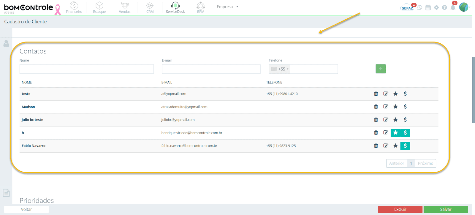 Imagem da seção "Contatos" do cadastro de cliente do ServiceDesk