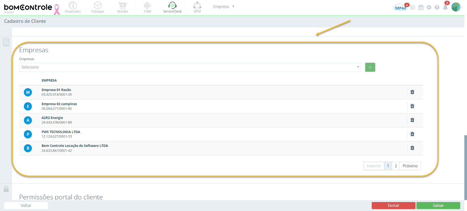 Imagem da seção "Empresas" do cadastro de cliente do ServiceDesk