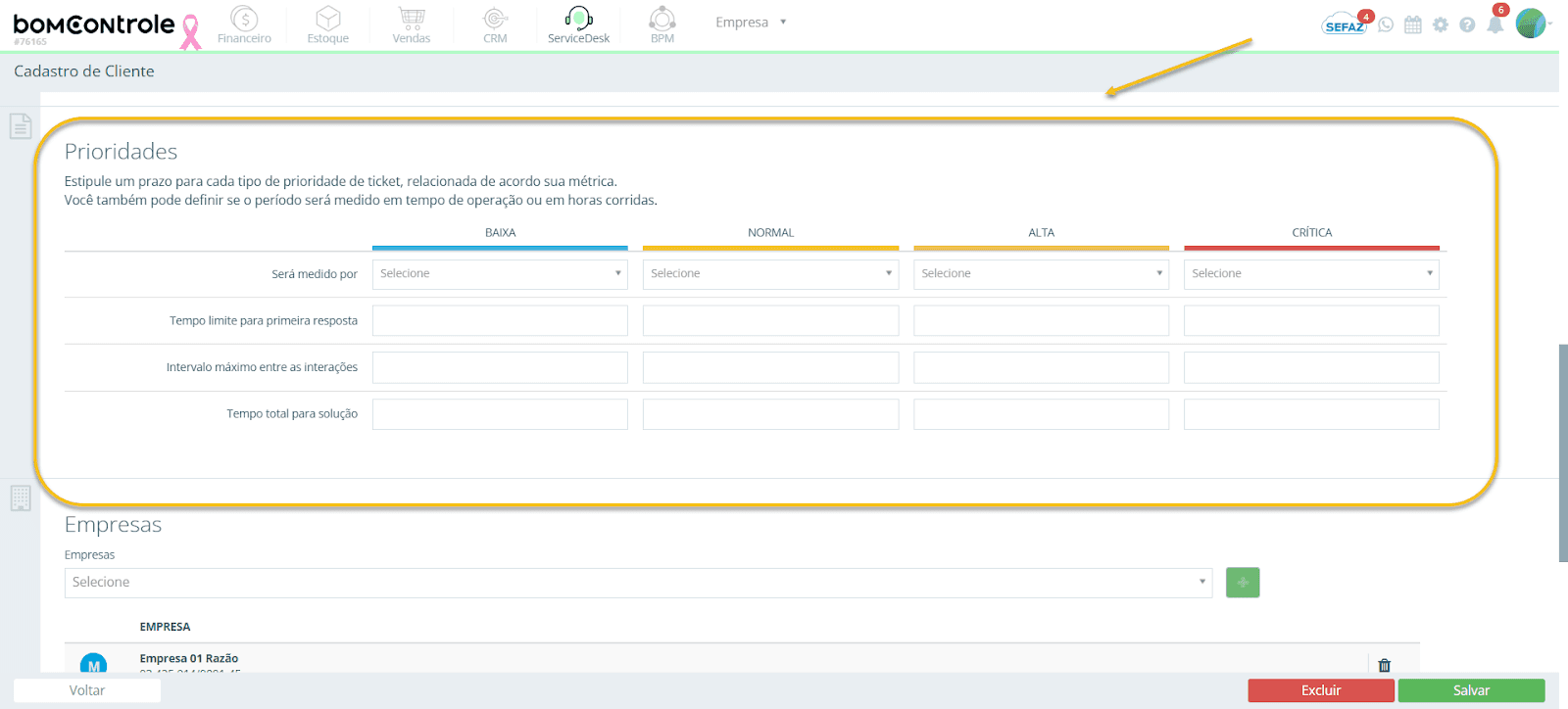 Imagem da seção "Prioridades" do cadastro de cliente do ServiceDesk