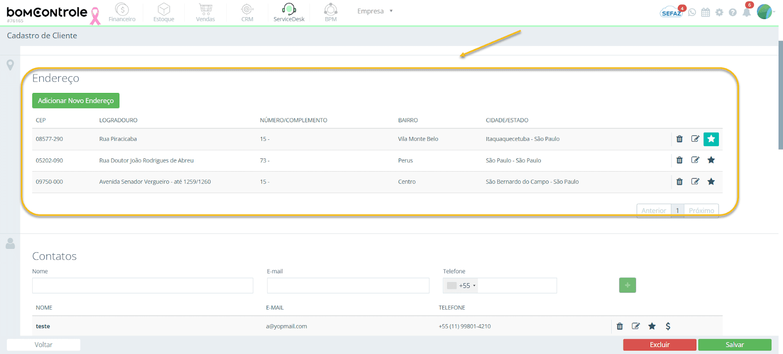 Observações: Não esqueça de salvar o cadastro do cliente após gerenciar os contatos, senão as adições/alterações não serão persistidas. Você pode adicionar quantos contatos forem necessários; eles serão listados em uma tabela logo abaixo, com opções para Excluir (ícone de lixeira) ou Editar (ícone de lápis) cada contato.