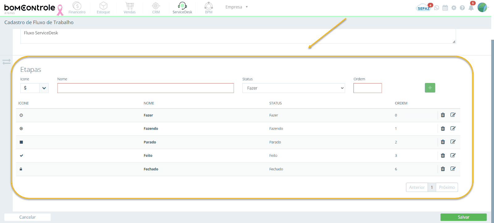 Observações: Nos módulos ServiceDesk e BPM, os nomes das etapas idealmente devem corresponder aos status padrão do sistema para evitar confusão (veja o campo Status/Status Ticket a seguir). No módulo Vendas (Ordens de Serviço), você tem liberdade para nomear as etapas conforme o processo interno da empresa.