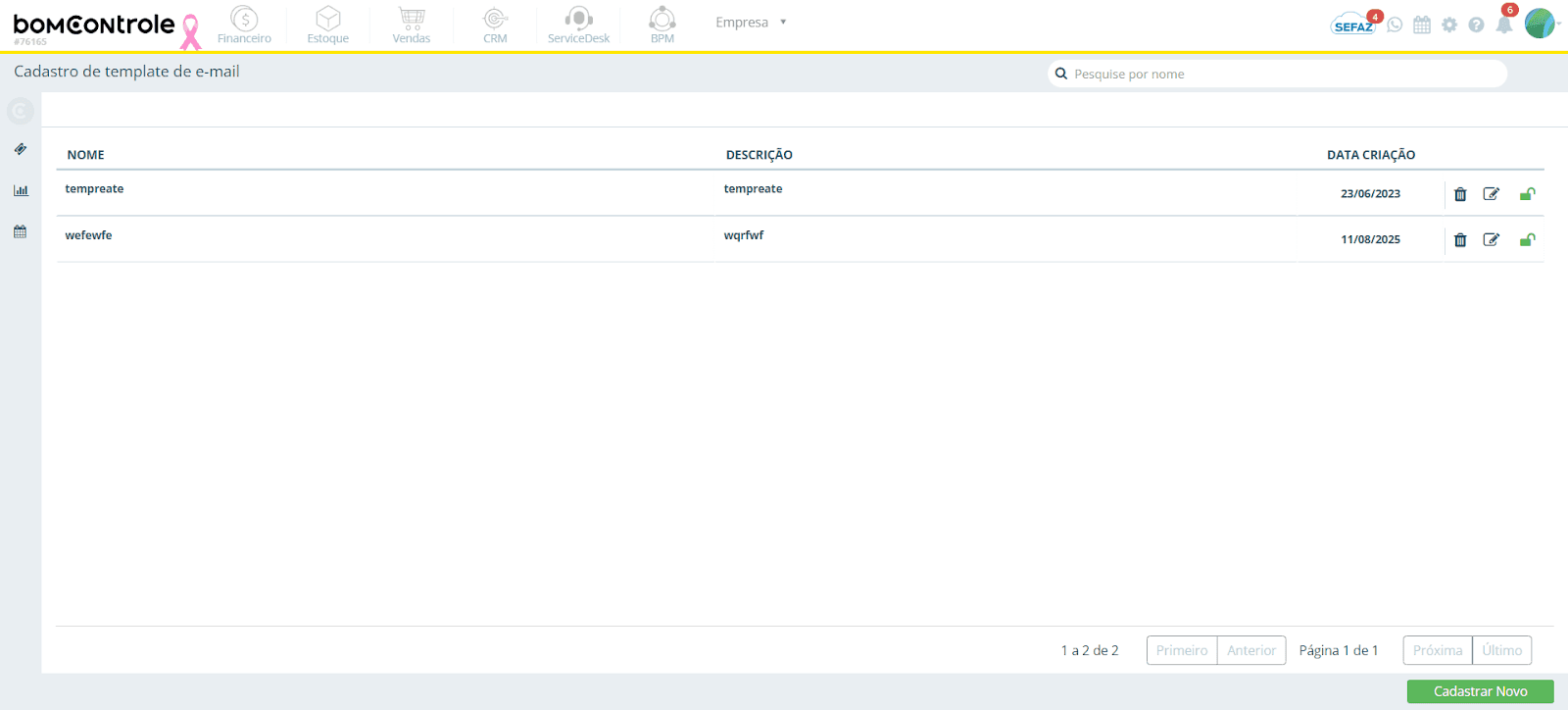A tela de listagem será exibida mostrando os templates de e-mail já cadastrados. Use o campo de busca no topo para filtrar templates pelo nome. Por padrão, todos os templates, inclusive os bloqueados (inativos), são listados. Na coluna de ações, os botões disponíveis permitem editar o template (ícone de lápis), excluir o template (lixeira) e bloquear/desbloquear o template (cadeado). Templates bloqueados ficam indisponíveis para uso em novas operações, mas permanecem no histórico. Para cadastrar um novo template, clique no botão Cadastrar Novo no rodapé da tela.
