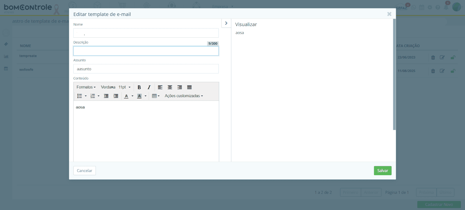 Impacto em outros módulos: O nome do template aparece nas listagens e filtros de seleção de template ao enviar e-mails através do BomControle (por exemplo, ao enviar um e-mail para um cliente em uma Oportunidade ou Ticket, o usuário escolherá o template pelo nome).