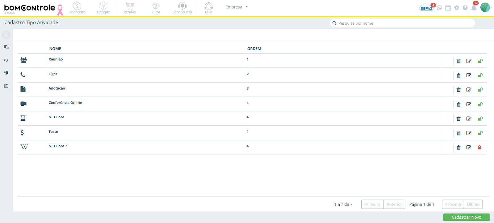 O objetivo deste manual é orientar o usuário no cadastro de Tipo de Atividade no BomControle. “Tipos de Atividade” categorizam e padronizam as atividades ou compromissos que sua empresa realiza, sendo utilizados em diversos contextos do sistema (agenda de atividades, tarefas de CRM, etapas de cobranças, etc.). Com esse cadastro, é possível definir, por exemplo, se uma atividade é uma Reunião, um Telefonema, uma Visita Técnica, ou outros tipos personalizados, associando ícones e ordem de apresentação para facilitar a organização.