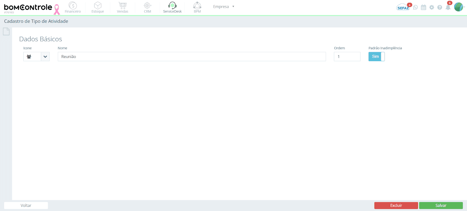 Impacto em outros módulos: Esse campo é utilizado principalmente no Financeiro, mais especificamente na funcionalidade de Régua de Cobrança (configuração de ações automáticas de cobrança para clientes inadimplentes). O tipo de atividade marcado como padrão de inadimplência será sugerido/usarado pelo sistema ao gerar atividades de cobrança automaticamente. Por exemplo, se “Cobrança por telefone” for o tipo padrão, o BomControle poderá criar atividades desse tipo na agenda de cobrança quando um título ficar vencido além do prazo definido. Nos módulos CRM ou ServiceDesk, esse atributo não é utilizado – ele é irrelevante para atividades de vendas ou atendimento.