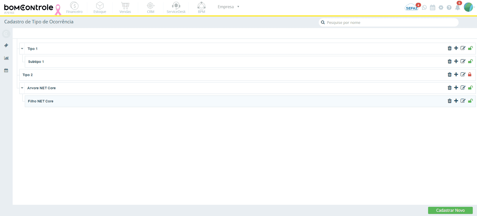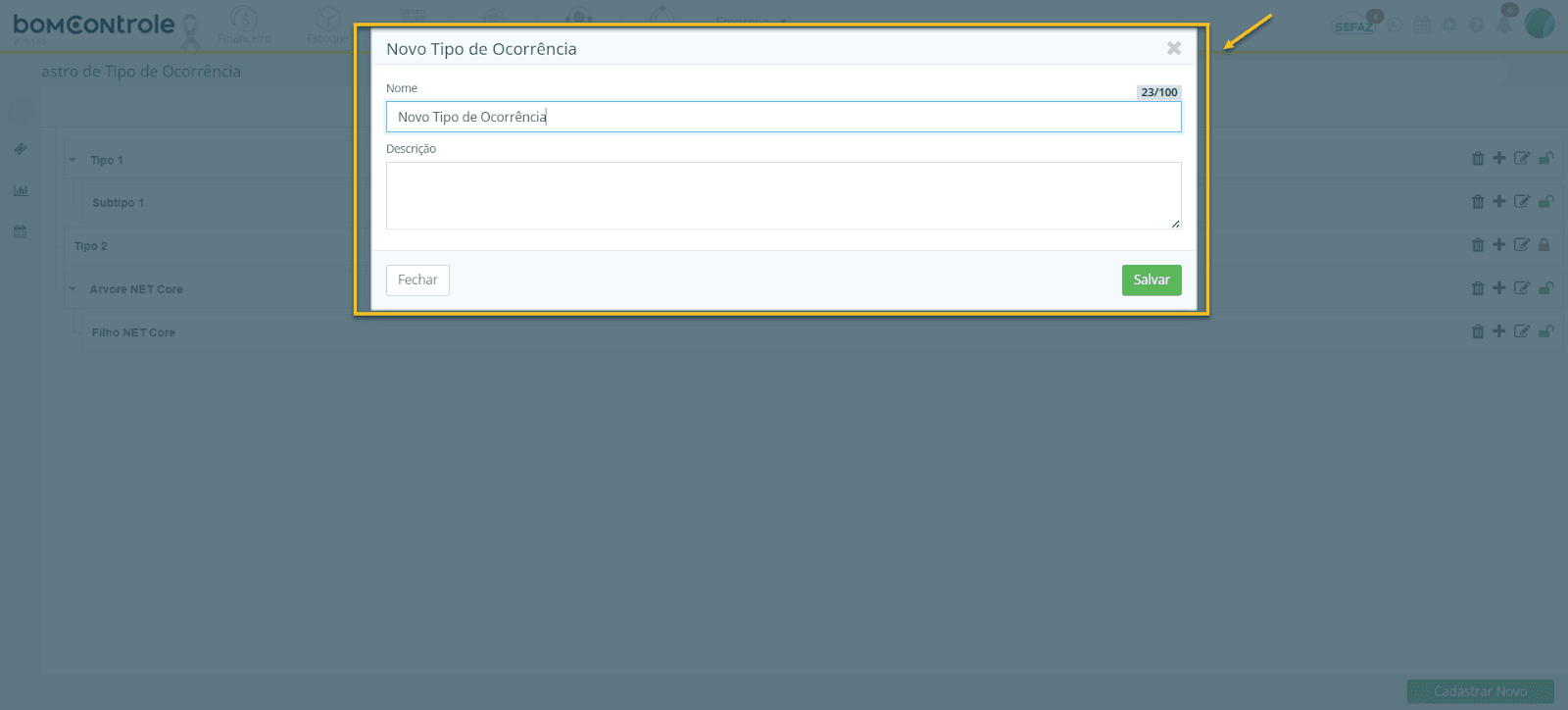 Para acessar a tela de Tipo de Ocorrência no BomControle: