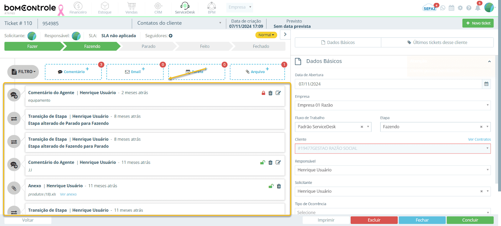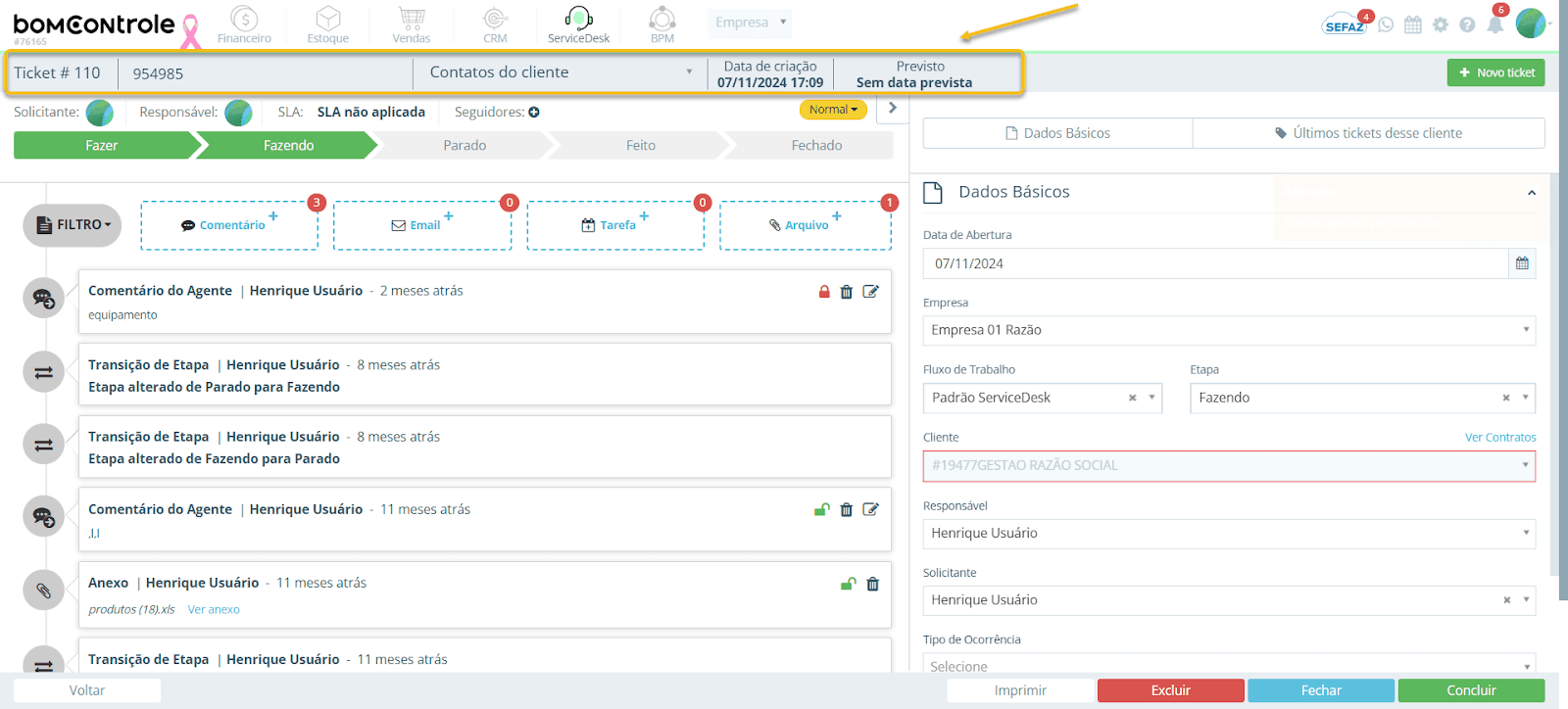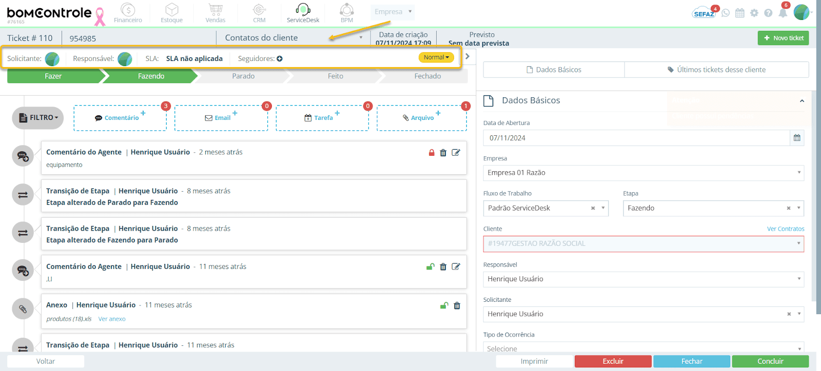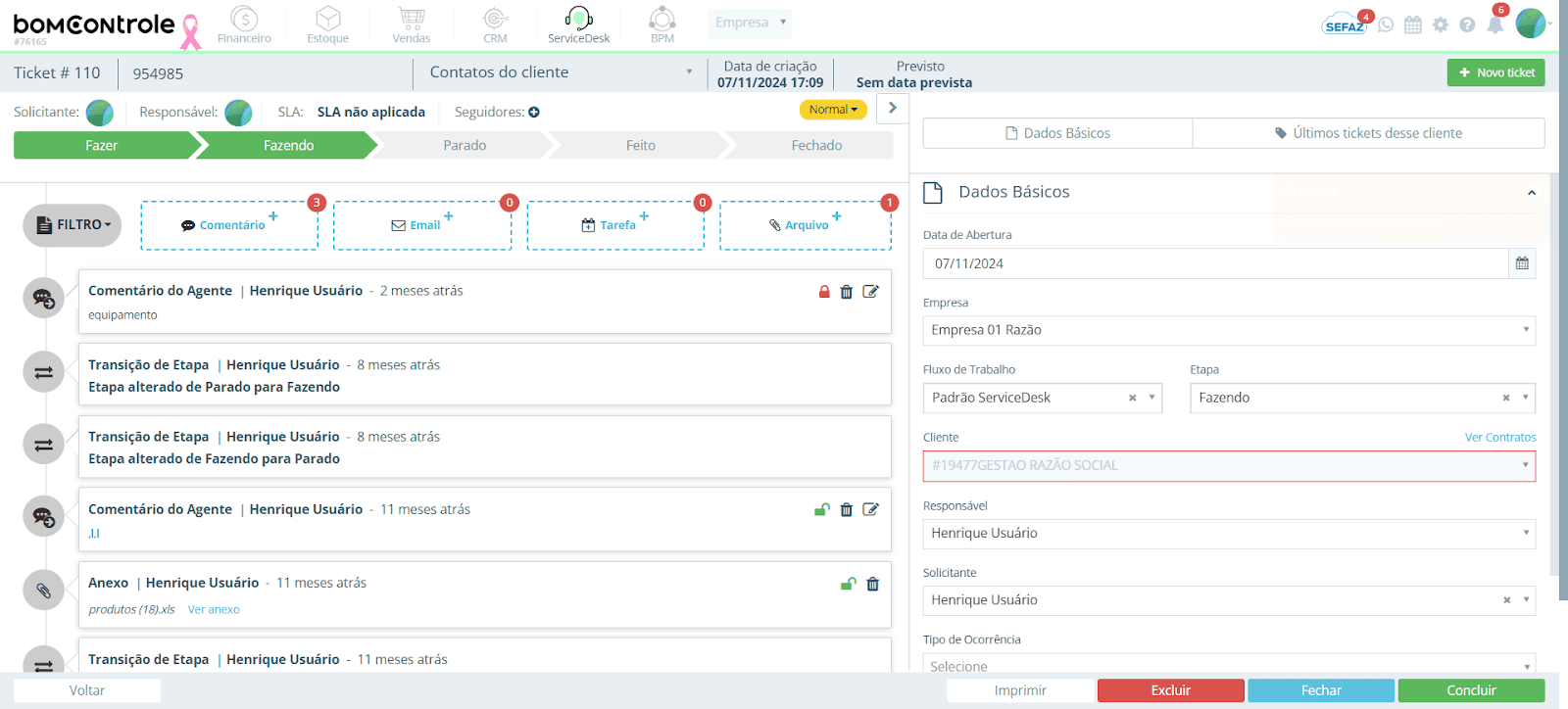 Impacto: o status em si é informativo do andamento do ticket. Estar “Feito” ou “Fechado” indica conclusão, mas não gera nenhuma baixa de estoque ou financeiro automaticamente – significa apenas que o atendimento foi finalizado no âmbito do suporte. Qualquer ação decorrente (como faturar horas de serviço, ou movimentar um item substituído em estoque) deve ser feita manualmente nos módulos apropriados. A barra de SLA não interage com outros módulos; serve para controle interno de cumprimento de prazos de atendimento.