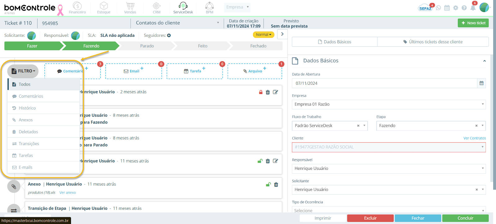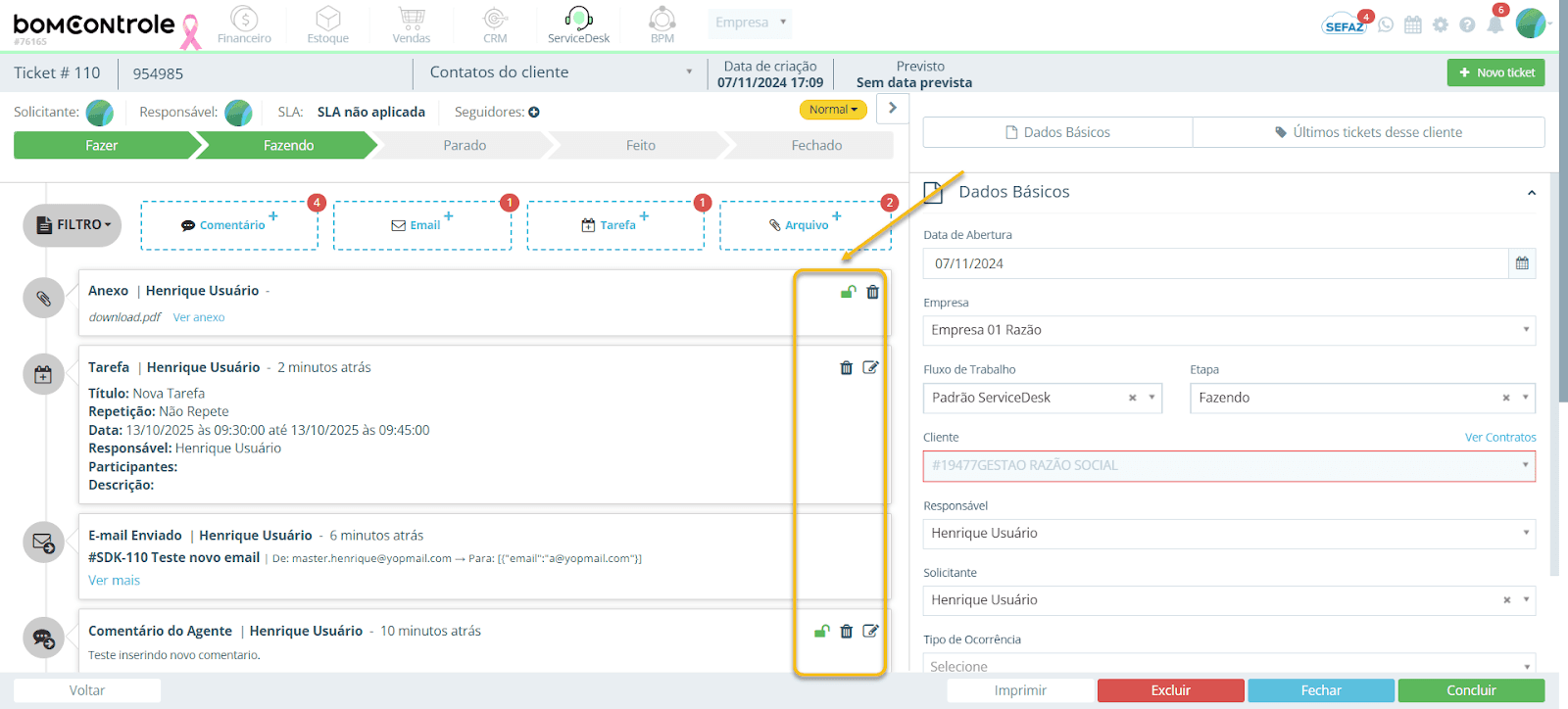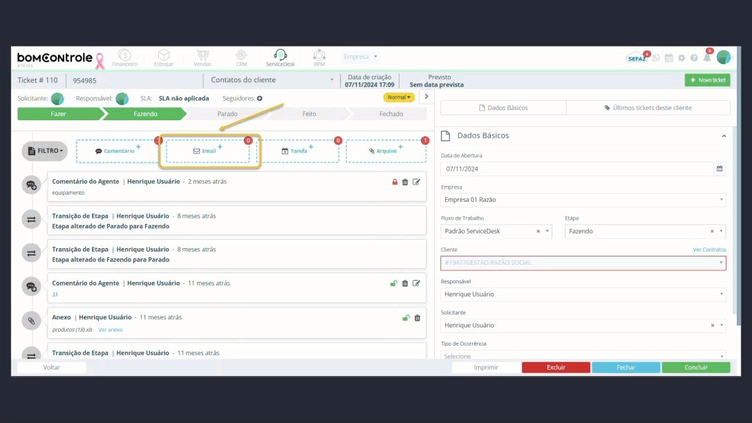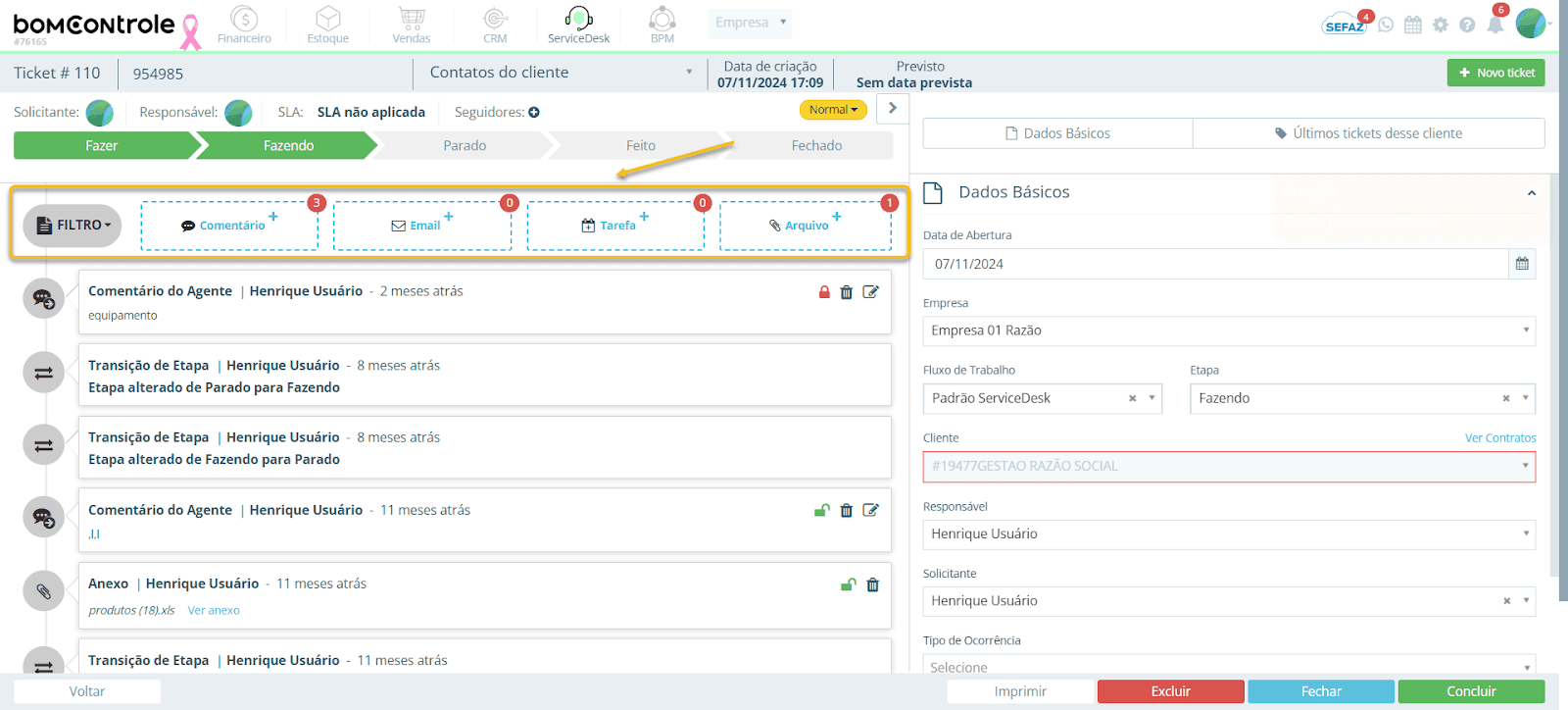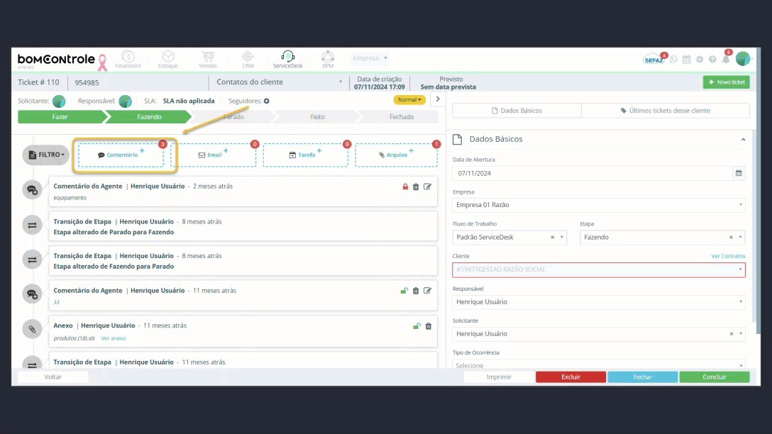Impacto: o status em si é informativo do andamento do ticket. Estar “Feito” ou “Fechado” indica conclusão, mas não gera nenhuma baixa de estoque ou financeiro automaticamente – significa apenas que o atendimento foi finalizado no âmbito do suporte. Qualquer ação decorrente (como faturar horas de serviço, ou movimentar um item substituído em estoque) deve ser feita manualmente nos módulos apropriados. A barra de SLA não interage com outros módulos; serve para controle interno de cumprimento de prazos de atendimento.